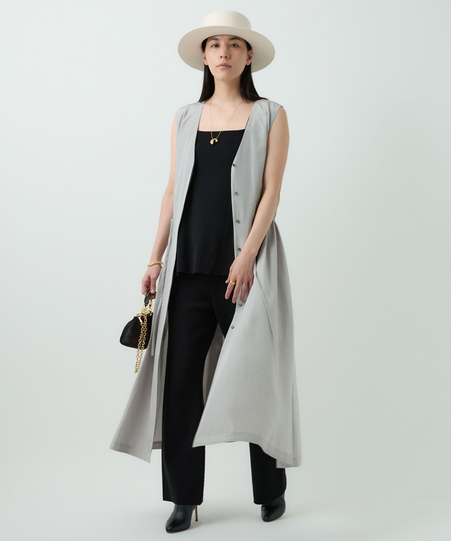 2025 PRE FALL COLLECTION-design-環境に優しいアセテートを100%使用した素材です。上品な光沢感と、手に取った瞬間に感じる、シルクライクな軋み感のある独特な風合いが特徴です。経糸にはフィラメント糸、緯糸にはスパン糸を使用することで、しなやかさと適度な張り感を両立しています。-how to care-こちらの商品は、ドライクリーニングでお願いしております。-fabric-ノースリーブの前あきワンピースです。まだまだ気温の高い時期から秋を意識した、ジレ風のデザインがポイントです。インナーに薄手のニットやカットソーをレイヤードして1枚でも。前を開けてジレ風に着るのもおすすめの着こなしです。ワンピースですがアウター感覚でさらっと着れる、スタイリングの楽しい一着。上品な光沢感がニットとの相性もよく、オンでもオフでも使える万能アイテムです。【Chaos(カオス)】「カオス」の時代にあっても、自由かつインディペンデントな感性を大切にする大人の女性たちへ。素材やディティールにこだわったオリジナルと国内外で買い付けたユニークかつアーティな感覚のセレクトをミックスした発信をしています。「大人の為の上質な日常着」