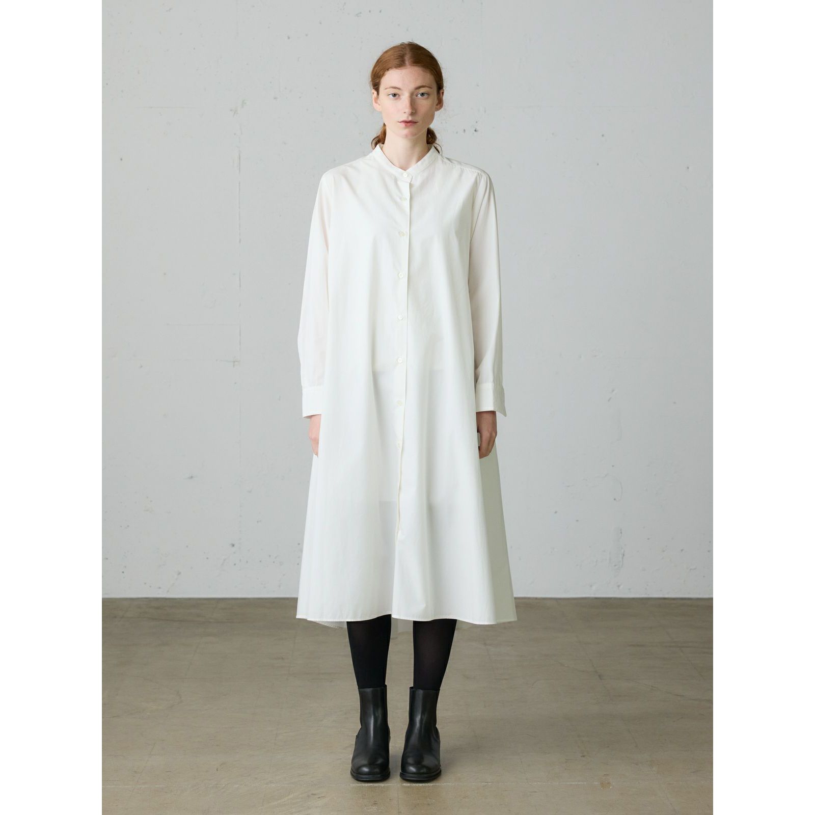 シリーズ展開で4-739729/Aラインバンドカラーシャツも展開。今季より定番のAラインシャツワンピースの袖を太く変更して仕上げました。前後差を付けた裾ラインはしなやかに丸みのある女性らしいシルエットを表現。さらりと1枚でも重ね着にも、素敵にシンプルにコーディネートができる1枚です。