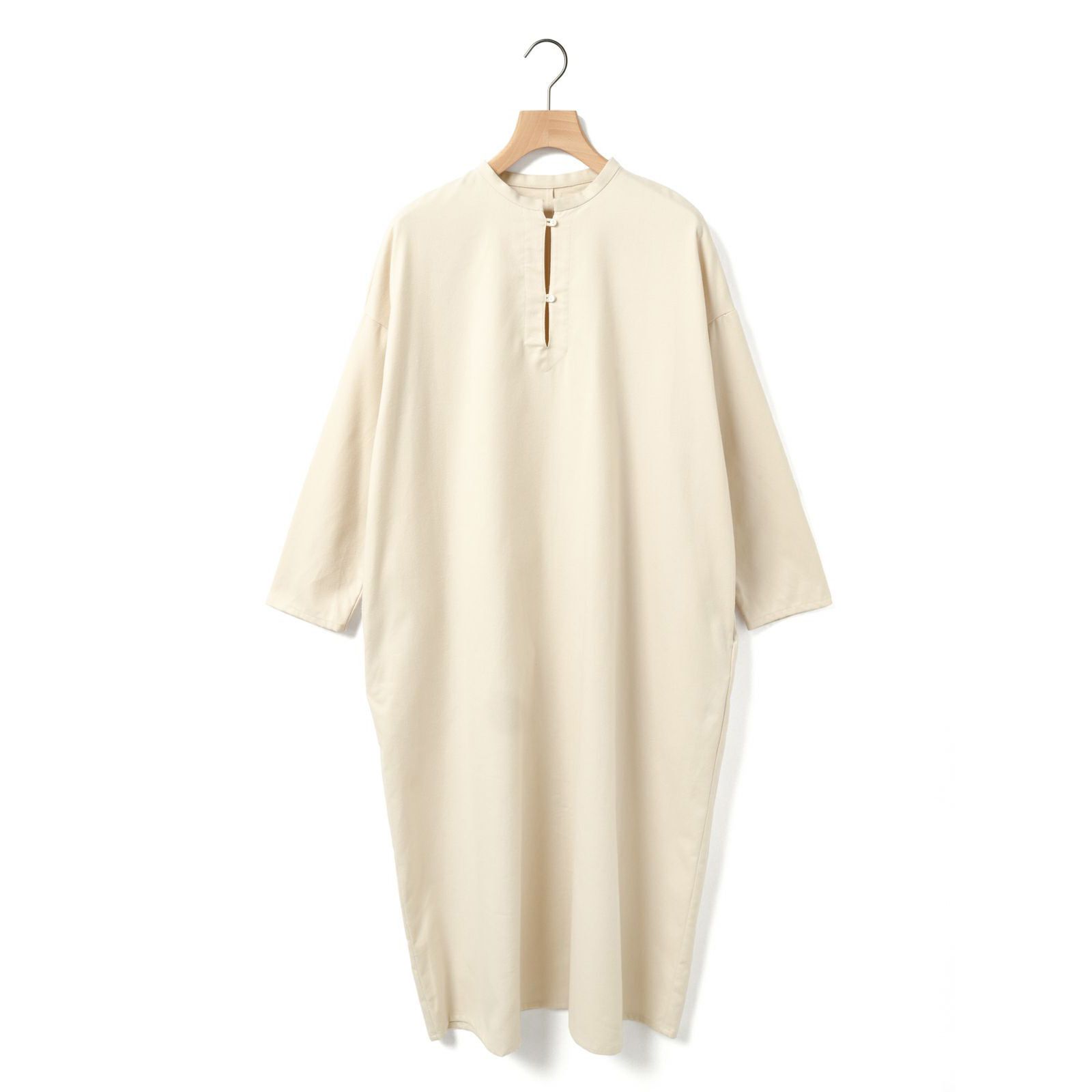 【HOMEシリーズ】広く身幅をとったリラックス感のあるワンピースが特徴。スキッパーあきになっており、タートルネックとの合わせもお勧めです。オーガニックコットンネルを使用しているのでアイボリーも暖か味がございます。ボトムをあわせたレイヤードも素敵です。※着心地を重視する為にブランドネームは外側につきます。