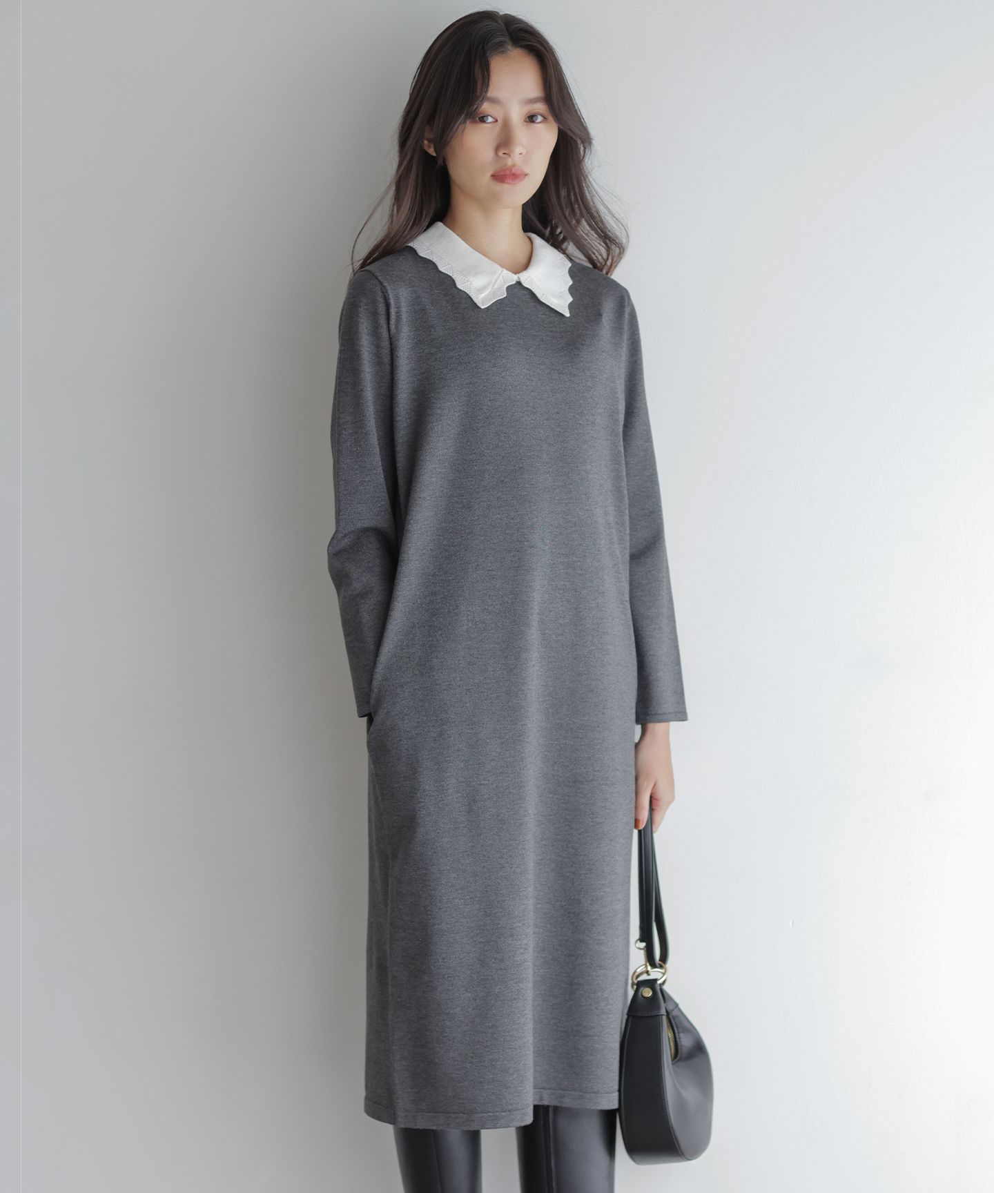 パールホワイトのレース柄編み襟がアクセント!大人の洗練ワンピース■デザイン・パールホワイトの端正なレース柄編みの襟が端正なニットワンピース。・程よくゆとりがあり、体のラインを拾いにくいサイズ感にこだわっています。・バックのパールボタンがアクセントになっており大人可愛いアイテムです。・キレイめなオンスタイルやカジュアルな着こなしもおすすめの大人可愛いニットワンピース。・襟もとにブランドタグが付いておりますが、パールボタンを前面にしてもご着用もいただける商品です。(着用時タグが気になる際は外してご使用ください。)■素材・着心地の良いストレッチ性と程よい保湿性のある合成繊維を使用した素材です。・細番手をハイゲージで編み繊細で暖かみがありながら柔らかな光沢感が上品な素材感。・軽くてスポンディッシュなストレッチを加え伸縮性のあるきゅっと詰まった編地は体のラインを拾い過ぎない適度な肉感が特徴です。【スタッフコメント】▼身長158cm|着用サイズ2 (通常着用サイズM)アクセントのある襟でトレンドのクラシック感がプラスされたニットワンピース。程よくゆとりのあるシルエットなのでニットワンピースに抵抗のある方でも着用いただける1枚です。============================洗濯方法:手洗い可裏地:なし伸縮性:あり透け感:ややあり============================【注意事項】※撮影時の照明の関係により、色味が若干異なって見える場合がございます。商品の色味はハンガー吊り画像をご参照ください。※画像はサンプルを使用しているため、実際にお届けする商品と色味やサイズ等の仕様に変更がある場合がございます。▼気になるアイテムは『お気に入り登録』がおすすめ▼お好きなカラー&サイズを選んで?マークをクリック!再入荷通知や、ラスト1点の通知、セールの通知も受け取ることができます。