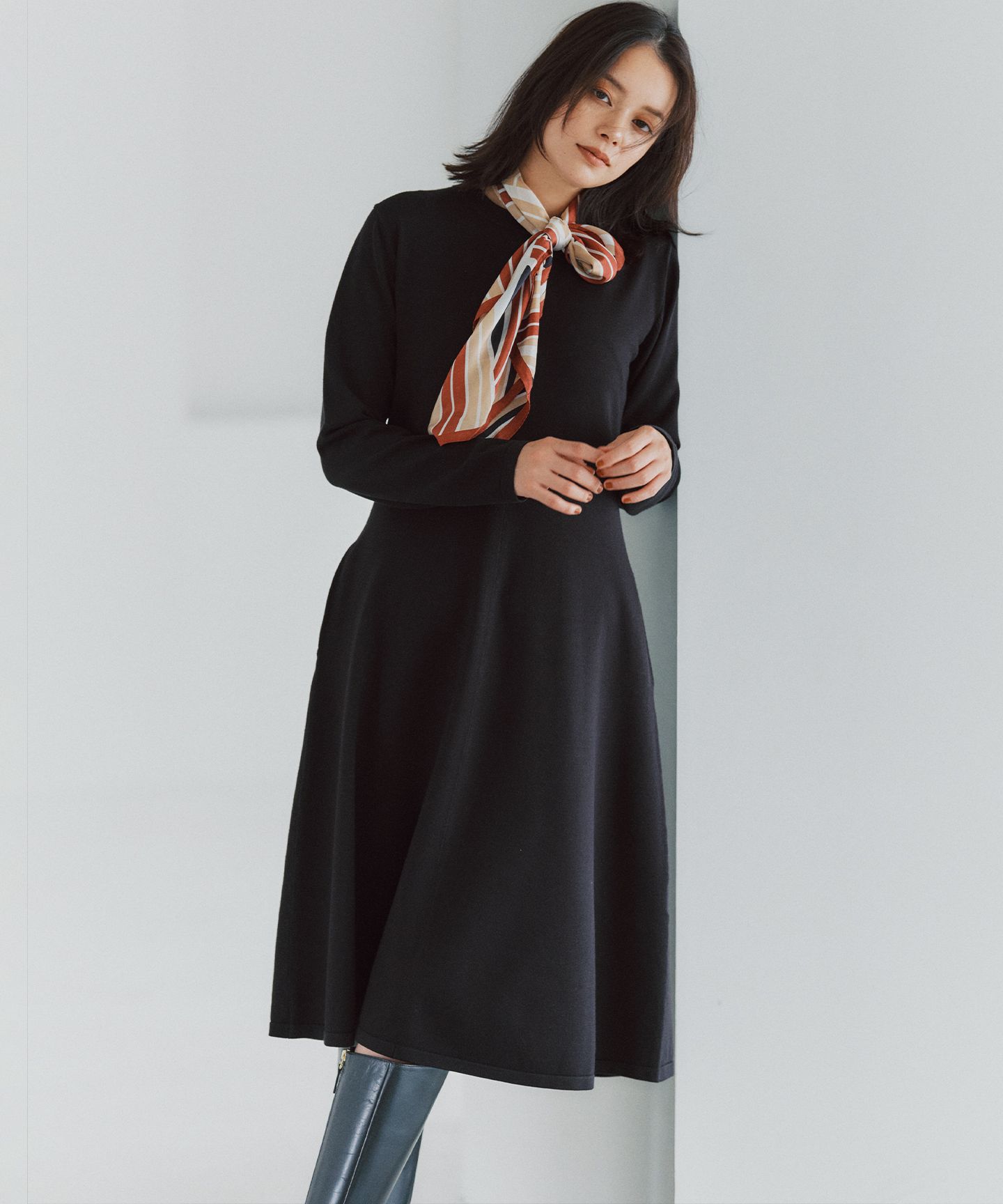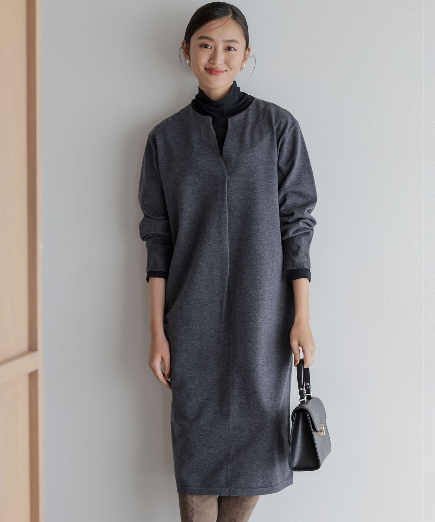 洗練されたシルエットの美しさにこだわった、リラクシーなニットドレス■デザインゆるやかなAラインでリラクシーな雰囲気はありながらも、きれいな表情と立体感のある素材で編み立てることで洗練された印象に仕立てたニットドレスです。ぴったりしすぎないシルエットは体型カバーも叶えてくれ、少し落とした肩線と裾のスリット、立体的なセンターラインを入れ、シンプルだからこそシルエットの美しさにこだわりました。小顔に見せてくれるネックの高さは、綺麗に立つように工夫しデザイン的にも機能的にも考えられた仕様です。ネック後ろのタテに並んだボタンが髪をまとめたときにチラっとのぞくのも素敵です。■素材着心地よいストレッチ性とほどよい保温性のある合成繊維を使用した素材です。細番手の糸をハイゲージで編み繊細できれいな表面感が特長です。さらに軽くてスポンディシュなストレッチ糸を加え伸縮性のあるきゅっとつまった編み目に仕上げ、もっちりとした風合いと体のラインをひろいすぎない適度な肉感、暖かみはありながらもやわらかな光沢感がさらに上品な印象にしています。※撮影時の照明の関係により、色味が若干異なって見える場合がございます。実際にお届けする商品の色味はハンガー吊り画像をご参照ください。※画像はサンプルを使用しているため、実際にお届けする商品と色味やサイズ等の使用に変更がある場合がございます。予めご了承ください。【お買い物をより楽しんで頂くために】▼商品のお気に入り登録ハートマークをクリックし、お好きなカラーを選んでお気に入りに登録が完了!完売カラーの再入荷通知や、ラスト1点の通知、セールの通知も受け取ることができます。▼ブランドのお気に入り登録新商品や再入荷等、いち早くブランドのお得な情報を受け取ることができます。