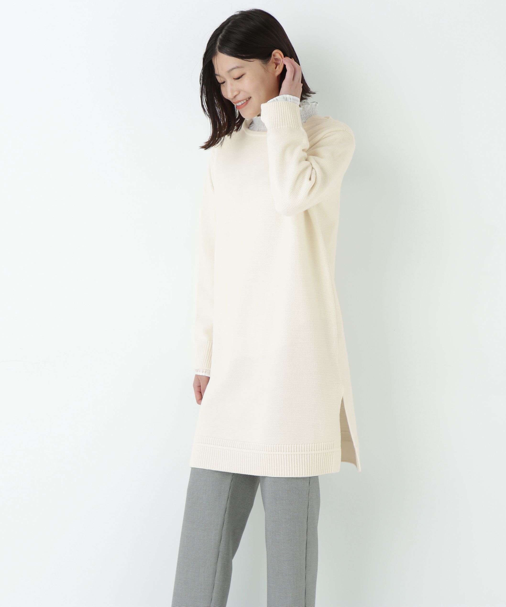 大人カジュアルな着こなしが決まるニットミニワンピース【デザインのポイント】パンツ合わせで着ていただけるミニ丈のワンピースです。襟元のボートネックデザインが今年らしく、大人カジュアルな見え方です。着ぶくれしない程よい身幅感を意識しています。【素材のポイント】ウールアクリルの膨らみと軽さのある糸を使用。編み地の目の大きさを変えることで、表面に凹凸感の見える編み方をしています。【おすすめコーディネート】すっきりとしたシルエットのパンツ合わせがおすすめです。同色系のワントーンカラーでコーディネートしていただくとよりニュアンス感のある上品な着こなしになりおすすめです。透け感/なし|裏地/なし|光沢/なし|生地の厚さ/普通|伸縮性/あり|シルエット/スタンダード
