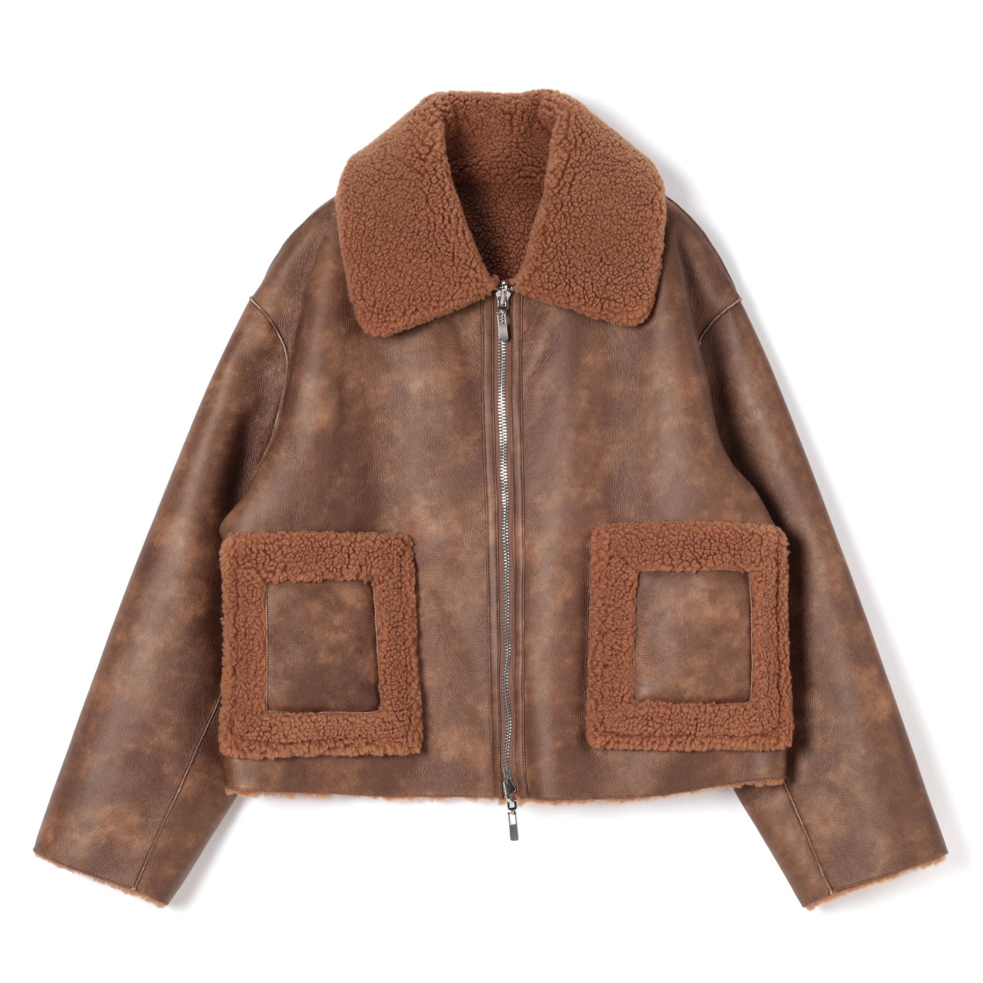 手ざわりの良いポリウレタンレザーで仕立てた、異素材コンビのジャケット。裏地にはふわモコのボア生地を使い、しっかりウォーミーに仕上げています。同色のボア生地に彩られたスクエア型のポケットと、チャーム付きのダブルジップにも注目です。