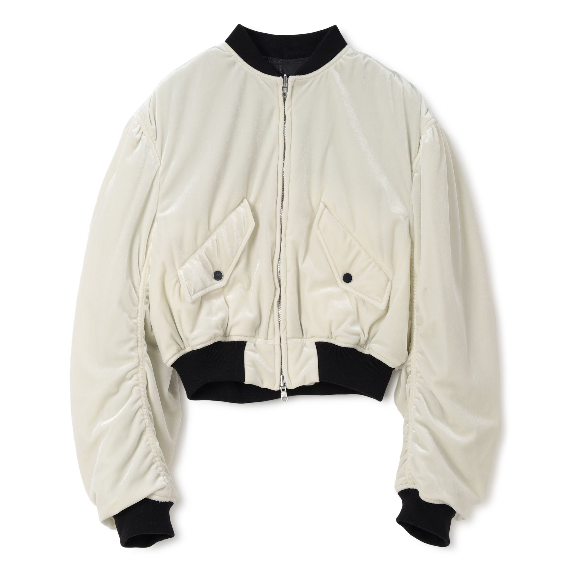 まるで違った風合い・表情が楽しめる、リバーシブルMA?1。表面はベロア調のバイカラー、裏面は25AWシーズンを象徴するスパーク柄でキャッチーに!袖にボリュームを持たせたコンパクト丈が視線を上向きにし、レイヤード時のバランスにも配慮しています。