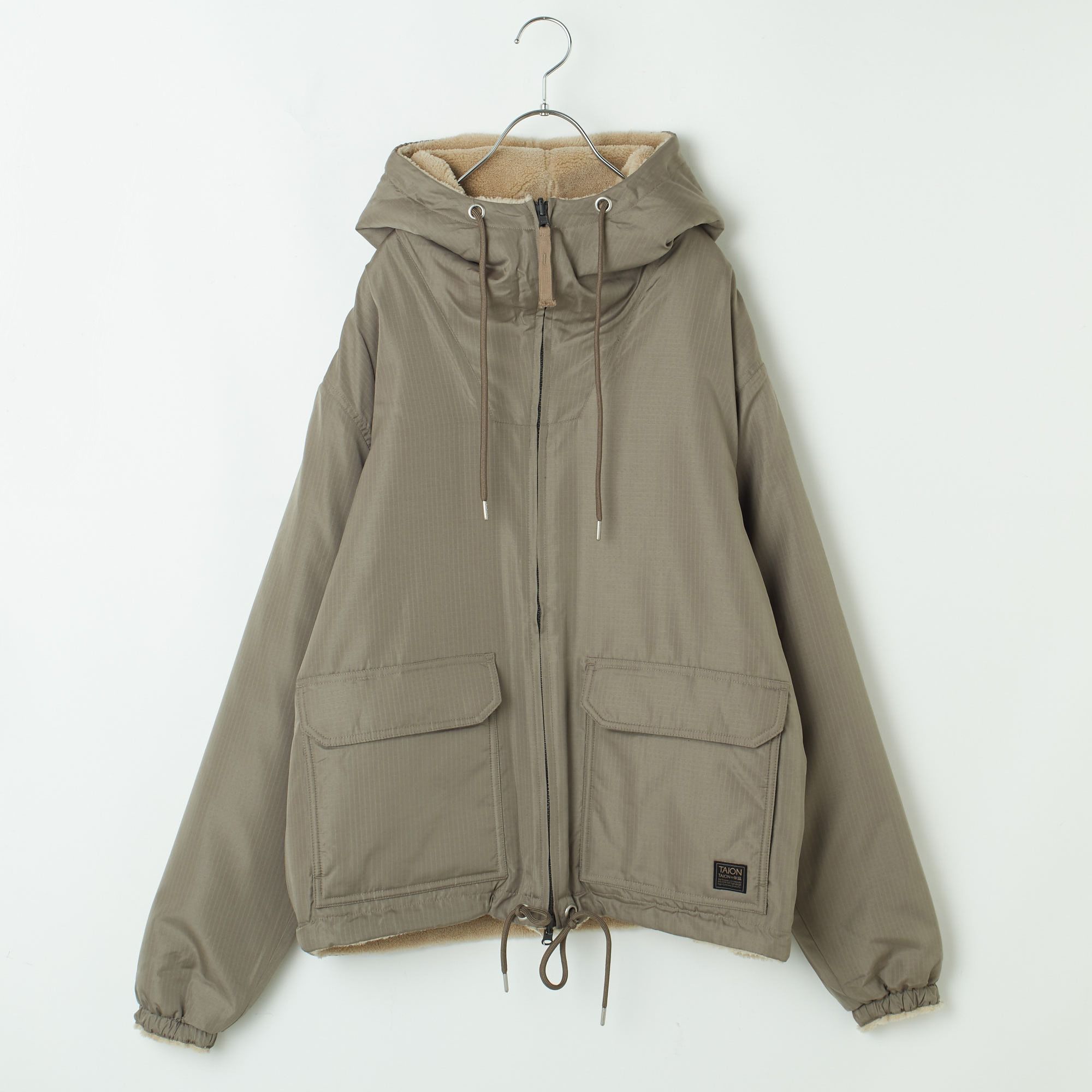 表面に防汚性の高いナイロンリップストップ、裏面に暖かなマイクロボア素材を使ったリバーシブルのフードジャケット。インナーダウンで知られるブランドが手がけた、軽くて高鮮度なノンダウンのアイテムです。フードと裾のドローコードや、両わきのスリットファスナーの開閉でフォルムを自在にアレンジできます。表裏両面に各2つのポケットあり。