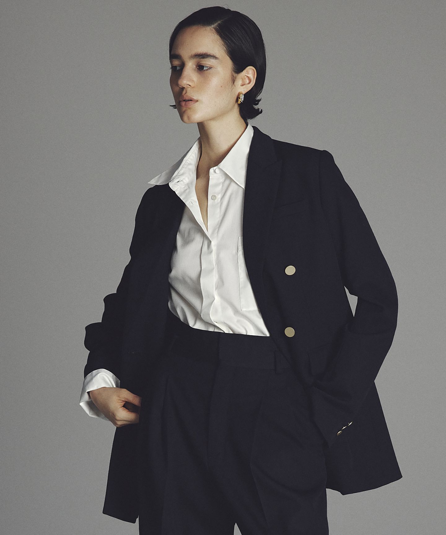 モヘアなど4種類の素材を絶妙なバランスで組み合わせたニットは、伸縮性があり着心地抜群。裏地もなくカーディガン感覚で着こなしやすい。金ボタンが高級感のあるクラシカルさを演出してくれる。きちんと感が求められるシーンでは、フロントの金ボタンはすべてとめて着用。