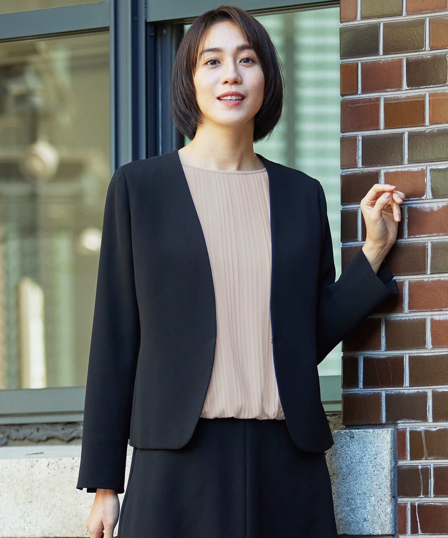 通勤や華やかシーンで活躍するノーカラージャケット■デザインシンプルなノーカラージャケットです。顔周りをすっきりと見せるシャープなV開きで、ボレロのような感覚で着用でき、同素材のスカート(SKWMCS0001)やワンピース(OPWMCS0001)と特に合わせやすいバランスの着丈となっています。通勤やセレモニーシーンなどに活躍します。■素材トリアセテートと特殊なポリエステルを使用した平二重素材です。シルキーでさらっとしたタッチとふくらみ感、適度な反発性を兼ね備えたことで、すっきりとした綺麗なフォルムになり体のラインが響きにくい素材に仕上がりました。適度なストレッチ性もあるので快適な着心地です。シワになりにくく、取れやすいというイージーケアな点もポイントです。※画像はサンプルを使用している為、実際にお届けする商品と仕様、加工、サイズが若干異なる場合がございます。予めご了承ください。※撮影環境の都合上、実際の商品と色味が異なって見える場合がございます。
