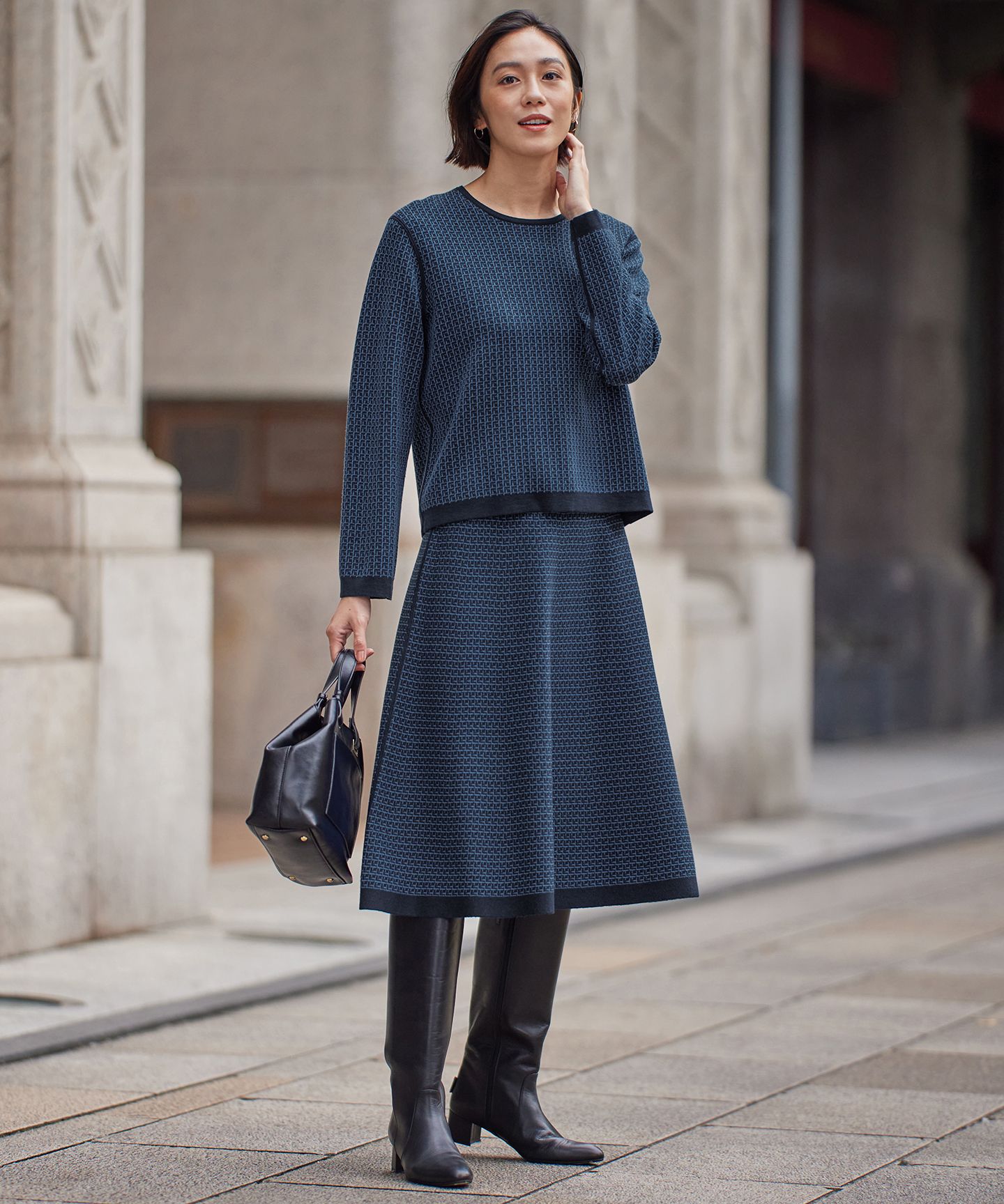 毎年大人気!組み合わせ自由自在なセットアップワンピース■デザイン毎年ご好評を頂いている、トップス、スカート共にリバーシブルで着用可能なニットセットアップです。定番のプルオーバーとフレアスカートのデザインで、今シーズンはツイードをイメージした格子状のチェックのような模様と無地のリバーシブルです。上下、表裏どのパターンで組み合わせてもスタイリングが決まりやすく、それぞれ単品としても着て頂ける汎用性の高いアイテムです。デイリーからドレスアップシーン、旅先でも活躍します。ネイビー×ブルー(175)はWEB限定カラーです。■素材セミ梳毛という梳毛と紡毛の中間の紡績で、厚すぎず薄すぎず適度な肉感の素材です。光沢感と発色があり、すっきりとキレイめに仕上げています。■同素材アイテムカーディガン×タイトスカートニットセットアップ(OPWMCW0552)※画像はサンプルを使用している為、実際にお届けする商品と仕様、加工、サイズが若干異なる場合がございます。予めご了承ください。※撮影環境の都合上、実際の商品と色味が異なって見える場合がございます。