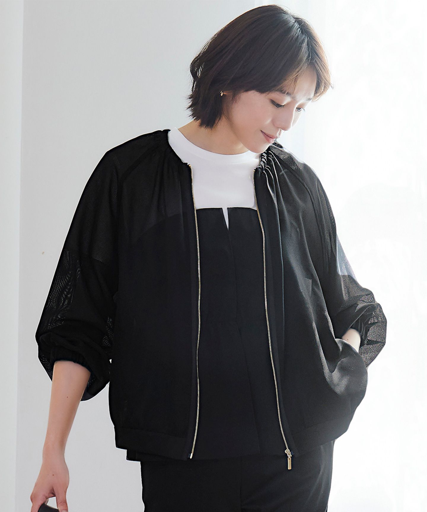 表情のある透け感が華やかなトレンドのメッシュブルゾン■デザイン襟周りにタックとギャザーを寄せ、今年らしいメッシュ素材に女性らしい柔らかで華やかな表情感を持たせたブルゾンです。透け感のある素材が涼やかで、軽くて持ち運びもしやすいので夏に向けて1着あると便利な羽織りアイテムです。ゴールドのファスナーも女性らしいポイントです。袖口はギャザー入りで、たくし上げて着て頂くことも可能です。コーディネートに取り入れるだけで今年らしい印象になる1着です。■素材麻調ポリエステルの糸を使用し、カラミ組織で織り上げたメッシュ素材です。メッシュならではの通気性の良さと軽さ、麻調ポリエステルならではのドライ感と肌離れの良さが特徴です。トレンドのメッシュ素材は透け感がありながらも程よく表情があり、新鮮な印象で着て頂けます。※画像はサンプルを使用している為、実際にお届けする商品と仕様、加工、サイズが若干異なる場合がございます。予めご了承ください。※撮影環境の都合上、実際の商品と色味が異なって見える場合がございます。