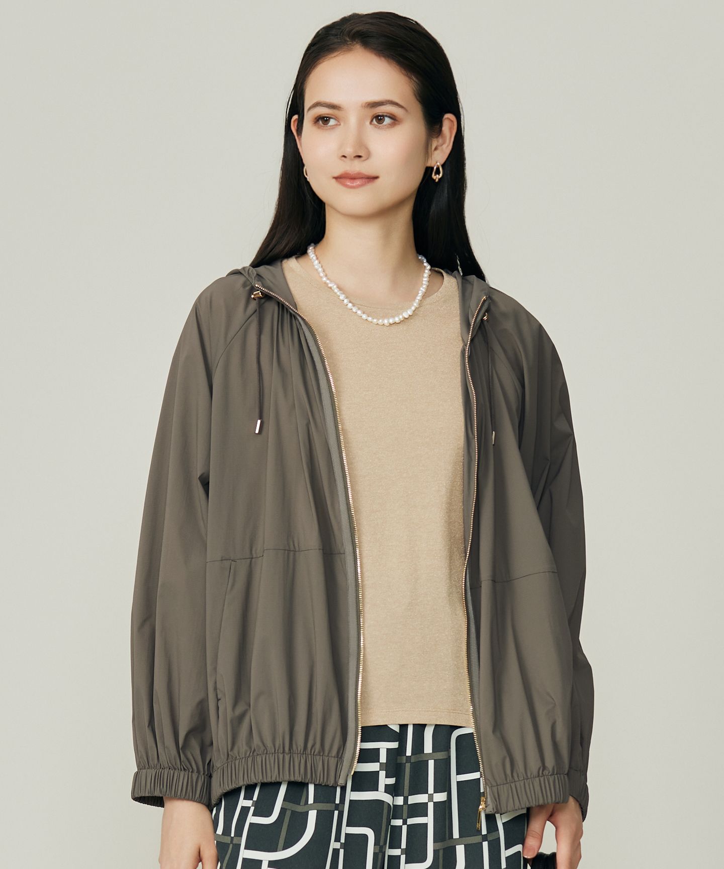夏の冷房対策にもおすすめな持ち運びしやすいブルゾン■デザイン襟ぐりと裾にたっぷりと入れたギャザーディテールが、程よく女性らしい印象のブルゾンです。フロントに繊細な輝きのゴールドファスナーと同色のグログランテープをポイントにした、大人っぽいカジュアルアウターです。ボリューム感のあるラグランスリーブは、袖口にゴムを入れているので袖をたくし上げることで生まれるフォルムがより抜け感を演出します。緩やかに前後差をつけた裾はヒップ周りを程よくカバーしてくれるのもポイントです。表面は撥水加工入りなので、ゲリラ豪雨の多いシーズンにもおすすめです。持ち歩きもできるよう、同素材の小さいバッグが附属するパッカブル仕様です。■素材細番手のナイロン糸を使用した、ナチュラルストレッチ性のあるリップストップ素材です。表面には撥水加工が入っています。軽量でありながら目の詰まった素材で、軽い雨なら内側に染み込みにくい機能性の高さが特徴です。■同素材アイテムベスト(VRWMGW0303)※画像はサンプルを使用している為、実際にお届けする商品と仕様、加工、サイズが若干異なる場合がございます。予めご了承ください。※撮影環境の都合上、実際の商品と色味が異なって見える場合がございます。