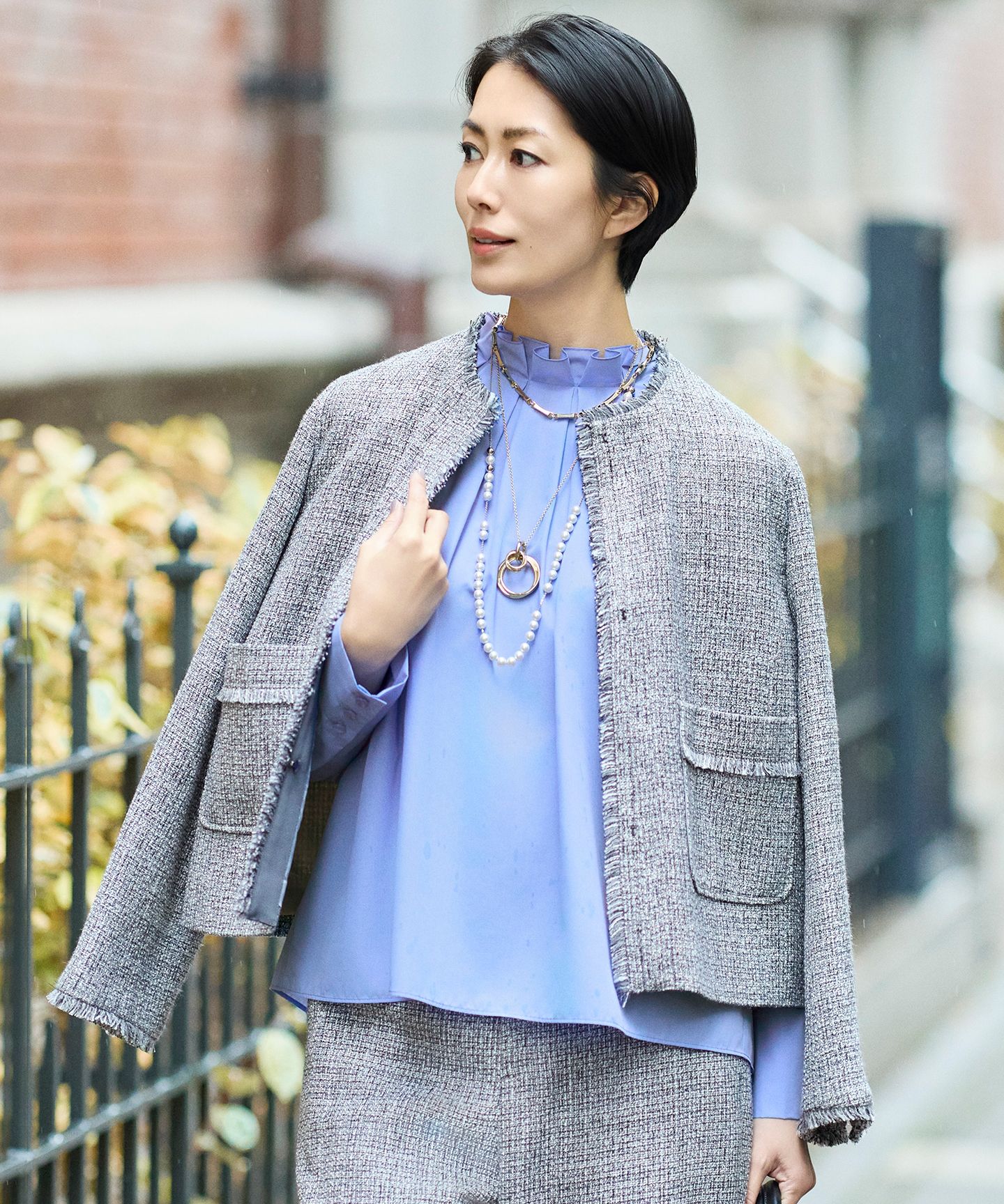 定番ジャケットのシルエットをアップデート■デザインカーディガンを羽織る感覚で着て頂けるボクシーなシルエットのツイードジャケットです。従来のツイードジャケットよりも、ややリラックス感を持たせた生地のタッチと表情感、共フリンジがアクセントになっています。ご好評いただいているジャケット(JKWMGS0010)から着やすさを残しながらも、広がりにくくすっきりと着て頂けるシルエットにアップデートいたしました。コーディネート次第で、セレモニーなどのオンスタイルからデイリースタイルまで幅広く活躍する1枚です。■素材カラーミックスされた糸と凹凸感のあるスラブ糸、繊細なラメ糸で華やかさを表現したラメミックスツイード素材です。軽くて柔らかく、繊細な光沢感が艶やかで、手触りも滑らかな上品なツイード素材です。■同素材アイテムジレ(VRWMGS0010)ワイドストレートパンツ(PRWMGS0010)丈短めワイドストレートパンツ(PRWMLS0010) ※画像はサンプルを使用している為、実際にお届けする商品と仕様、加工、サイズが若干異なる場合がございます。予めご了承ください。※撮影環境の都合上、実際の商品と色味が異なって見える場合がございます。