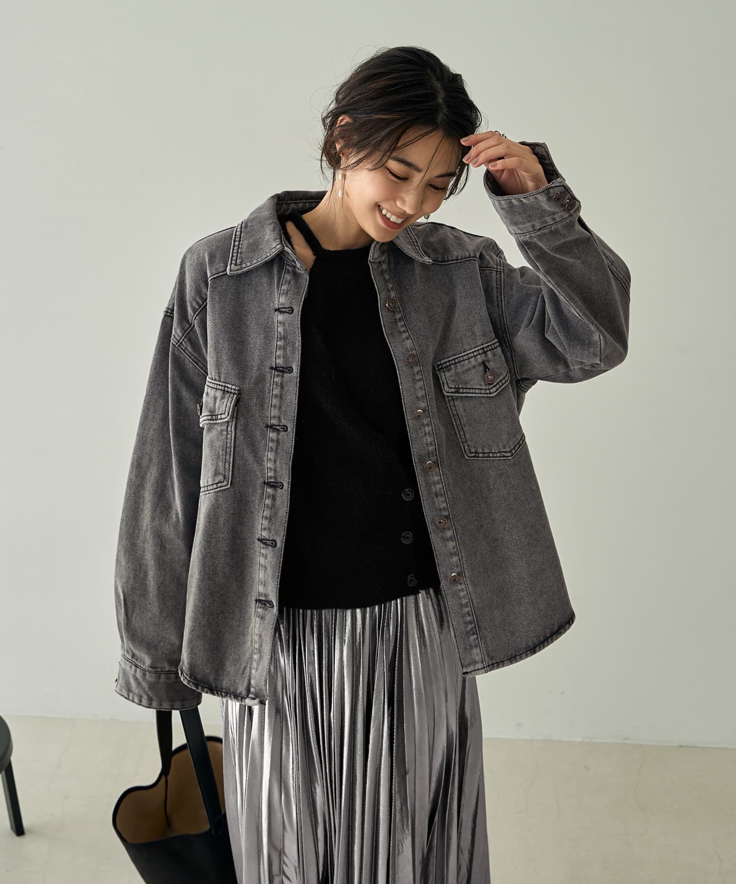 シャツというよりは軽いアウターに近く、Gジャンのように使用する気軽なアウターです。一番の主役はやはりキレイな色合いですが、ボタンホールの糸かがりデザインや、普通よりも多めに付けたフロントボタンなど、ちょっとしたディテールにもコダワリがあって可愛い。中に厚手のニットも着込めるゆったりサイズ感になっており、スカートやパンツ全般はもちろん、ワンピース合わせも似合います。◆生地の厚さ:デニムパンツと同じくらい。Gジャンよりは少し薄く、デニムシャツよりは厚地です。◆ボタンの色:凹凸の凸部分は、10円玉のような赤銅色。凹部分はブラックメッキで全体的にヴィンテージ感があります。裏側はシルバーですが表から見て目立たず、合わせるアクセサリーのお色などは問いません。◆サイズ感:オーバーサイズまではいかない、一歩手前の感じのゆったり感がカワイイジャケットです。◆重ね着:この上にコートを着れるか/かなり袖幅が大きく、オーバーサイズなコートであれば着れることもありそうですが、普通のコートではまず難しいかなという感じです(※これ自体が割とゆったりしており、袖幅も太いため、肩や袖がキツくなりそうです)。【お知らせ事項】色合いのキレイさを保つためには、極力洗わないようにするのがベターです。デニム製品は洗えば洗うほど色合いが落ちていきますので、様子を見ながらご自身で調節するようにしてください。【商品の特徴】◆着用時期:夏以外◆暖かさ:Gジャン程度の暖かさ◆サイズ感:ゆとりのあるサイズ感◆スリット:なし◆厚み:厚すぎず薄すぎず適度な厚み◆柔らかさ:デニムジャケットの中では柔らかく、適度なハリ感もあり◆着用ジワ:できにくい◆毛羽立ち:できにくい◆伸縮性:なし◆光沢感:なし◆透け感:なし◆ボタン:フロント、胸ポケット、袖口にポケットあり◆ファスナー:なし◆ポケット:胸ポケットあり◆裏地:なし◆手洗い:可能◆アイロン:可能(当て布使用。中アイロン。)◆重量:約600g【お色について】◆グレー:ヴィンテージ感のある色落ちしたような褪せた発色のグレー。◆カーキ:グリーンに僅かにグレーを混ぜたような、グレイッシュな発色のカーキ。※商品コメントの内容はブランドプロデューサーによる説明文です。