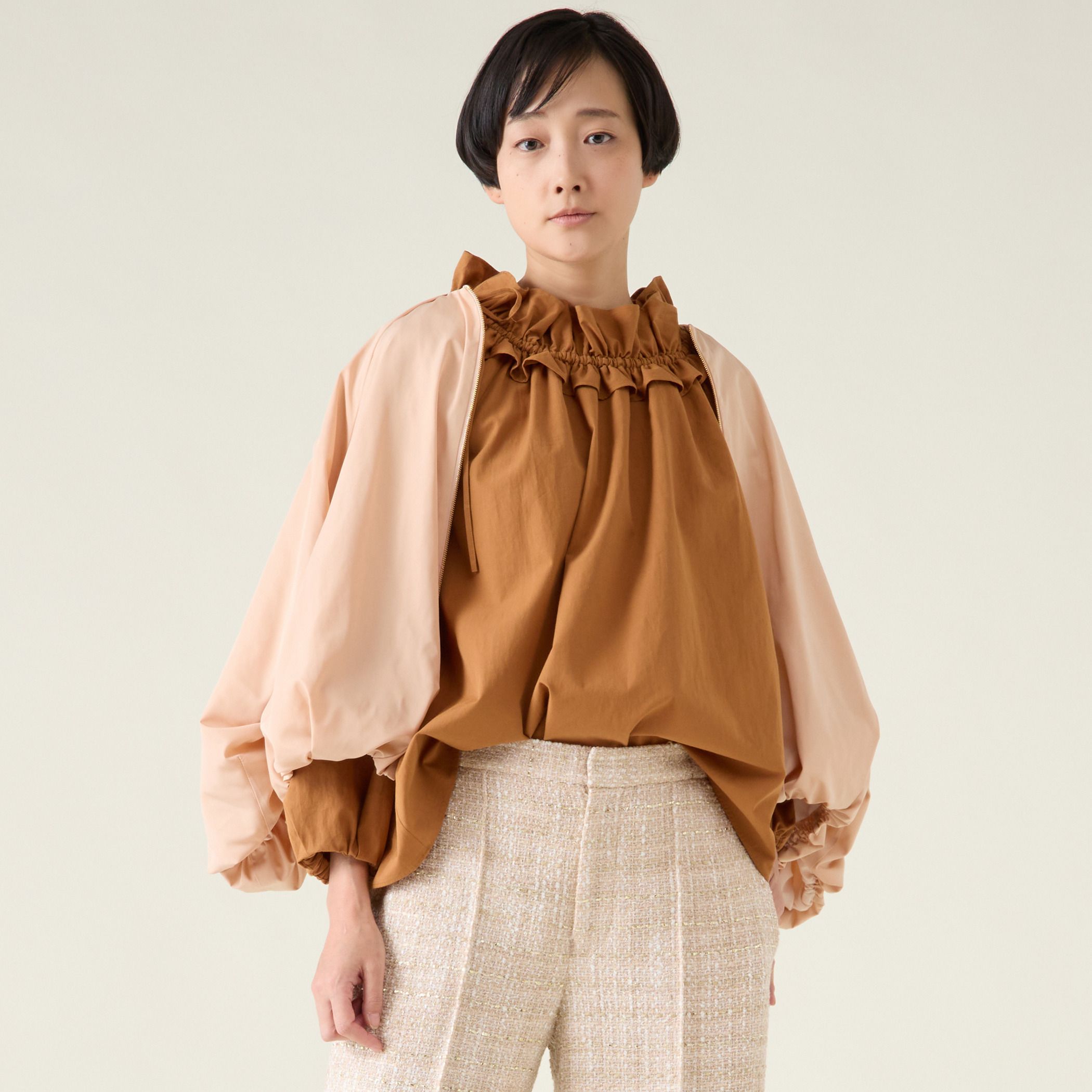 形状記憶のハリ感のあるタフタ素材。少しマットな光沢感が上品な印象です。襟にはたっぷりギャザーをいれたデザイン。後ろ中心のみゴムギャザーで体にフィットする仕様。フロントから脇をギャザーを入れない事できれいめな印象に。袖もすっきり着用できるよう内側のみゴムをいれ、ブラウジングできるようにしています。