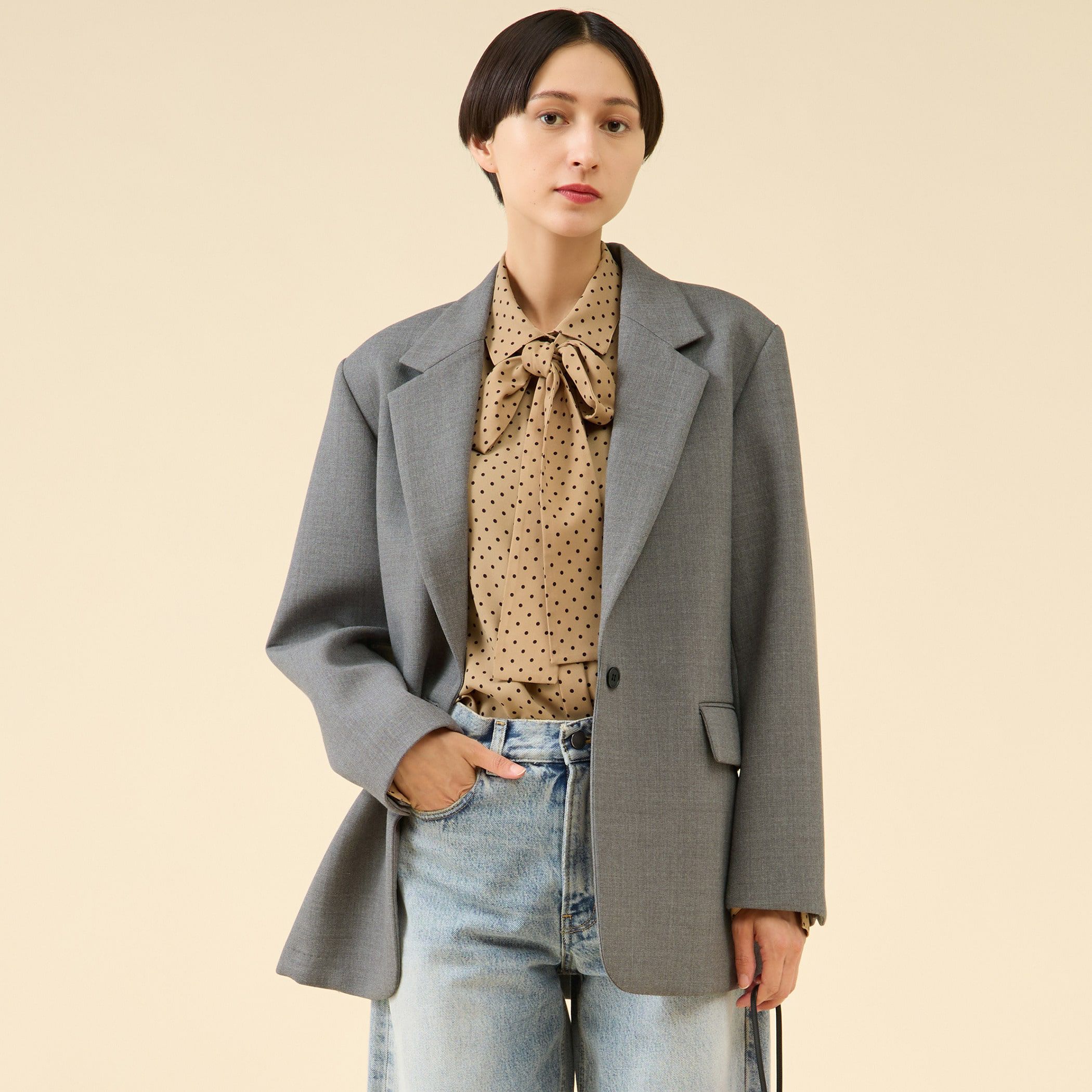ややゆったりとしたリラクシーなシルエットになっていて丈も少し長めに変更しています。ステッチもなしにしてより大人っぽく着てもらえるようなエレガントなムードに。普遍的なデザインだからこそサイズ感などが大切になるアイテム。今のムードに仕上がっています。日本のジャケットに特化した工場で丁寧に縫製されています。≪素材、着心地≫ 素材は細番手の梳毛素材を使用。美しい光沢感もあるので綺麗に着ることができます。さらっとした着心地で通年羽織ってもらえる素材感です。≪おすすめの着こなし≫セットアップで持っておけばあらゆるシーンに対応可能。透け感:なし伸縮性:なし光沢感:ややあり裏地:背抜き生地の厚さ:普通
