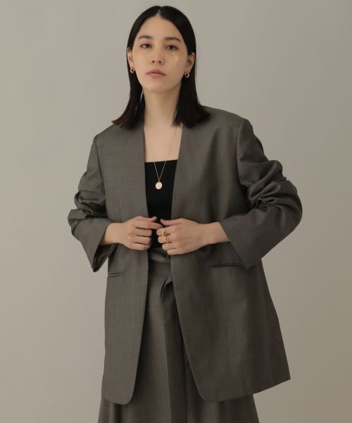 Super120を使用したトロピカル素材になります。ライトウエイトなうえ上質なぬめり感と清涼感が融合した独特な風合いになります。-design-ノーカラーのオーバージャケットになります。襟の開きのラインに拘り着用感もある程度のゆとりと締まった感じのラインがポイントになります。同素材のスカートとセットアップでの着用がおすすめです。