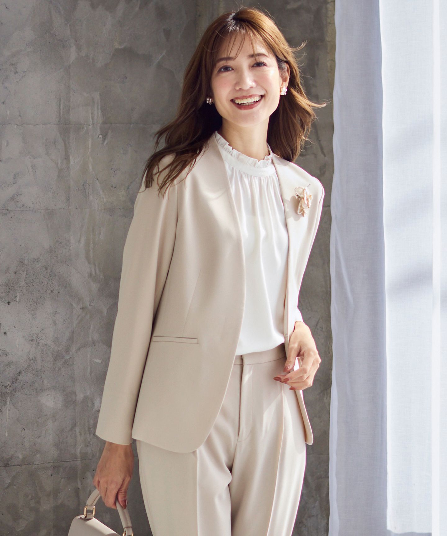 大人気セット企画を今年も優木まおみさんとのコラボでお届け!上下ワンツーで着るだけで素敵に決まる♪セレモニーや通勤など幅広いシーンで着回せるセットアップここに注目!「秒映え」ポイントPoint1:アクセサリーなしでも着映える襟元Point2:おしゃれに体型カバーできるペプラムデザインPoint3:トレンド感のある上品ワイドパンツPoint4:穿き心地のよいウエストゴムPoint5:きちんと見えするセンタープレス■デザインワンツーコーデで楽なのに、着るだけで品よく今っぽく決まる!毎年大人気の企画が今年もアップデートして登場しました。セレモニーシーンはもちろん、お仕事やママ会など幅広いシーンでの着回しをお楽しみいただけます。トップス:ペプラムデザインなので気になるお腹とお尻周りをさりげなくカバー。高め位置のウエストタックでスタイリングの重心を上に上げることでスタイルアップ効果も期待できます。取り外し可能な胸元のパーツにはパール調モチーフをミックスしているので、アクセサリー無しでも上品に決まります。袖口はゴム仕様で、袖をまくったこなれ感ある着こなしもおすすめです。今年はふんわり感を残しつつも程よい甘さのボリューム感と落ち着いた着丈感に全体をリバランス。ボトムスのバランスにぴったり合うよう、サイズ感や袖丈のバランスなど、細かいところまで微調整を加えています。パンツ:トレンドのワイドパンツを取り入れ、実用性も洒落見えも兼ね備えたコーデでイマドキ感をしっかりアップデートしました。パンツ丈はルーズに見えないようにくるぶし丈で上品に。センタープレスも効かせてきちんと感も装備しました。後ろウエスト部分はゴム仕様なので、なにかと動くことの多いセレモニーシーンでも楽な着心地に。センタープレスにはセンタークリース加工を施し、洗濯をしても綺麗なセンタープレスを保てるようにしています。(裏地なし/両脇ポケット付き/後ろポケットフェイク)■素材上品なセミマットの表面感と程よいハリコシ感のあるポリエステルストレッチ素材を使用しています。セレモニーシーンにぴったりのきちんと見えする素材ながら、長時間着ていても疲れないストレスフリーな着心地を兼ね備えています。洗濯機洗いが可能でご家庭でのお手入れが簡単な点も嬉しいポイント。春に嬉しいUVカット性があり、また花粉が付きにくく落ちやすいため機能性も抜群です。■同シリーズアイテム【優木まおみさんコラボ】秒映えセレモニー ブラウス × ジャンパースカートこちらの商品はサイズバリエーションがございます。Rレギュラーサイズ(OPWPGS0192) S小さいサイズ(OPWQGS0192) L大きいサイズ(OPWKGS0192)※花粉が付きにくく落ちやすい効果は永久的なものではございません。※商品画像はサンプルを使用しているため、色味やサイズ等の仕様に変更がある場合がございますので、予めご了承ください。※屋外での撮影画像は、光の加減で色味が違って見える場合がございます。商品の色味はスタジオ撮影の画像をご参照ください。#anySiS #エニシス #エニィシス #レディース #2SET #セットアップ #優木まおみ #コラボ #ブラウス #パンツ #きれいめ #きれいめファッション #きれいめコーデ #大人レディ #フェミニン #レディスタイル #オフィスコーデ #オフィスカジュアル #通勤スタイル #オケージョン #入卒 #入学式 #卒業式 #セレモニー