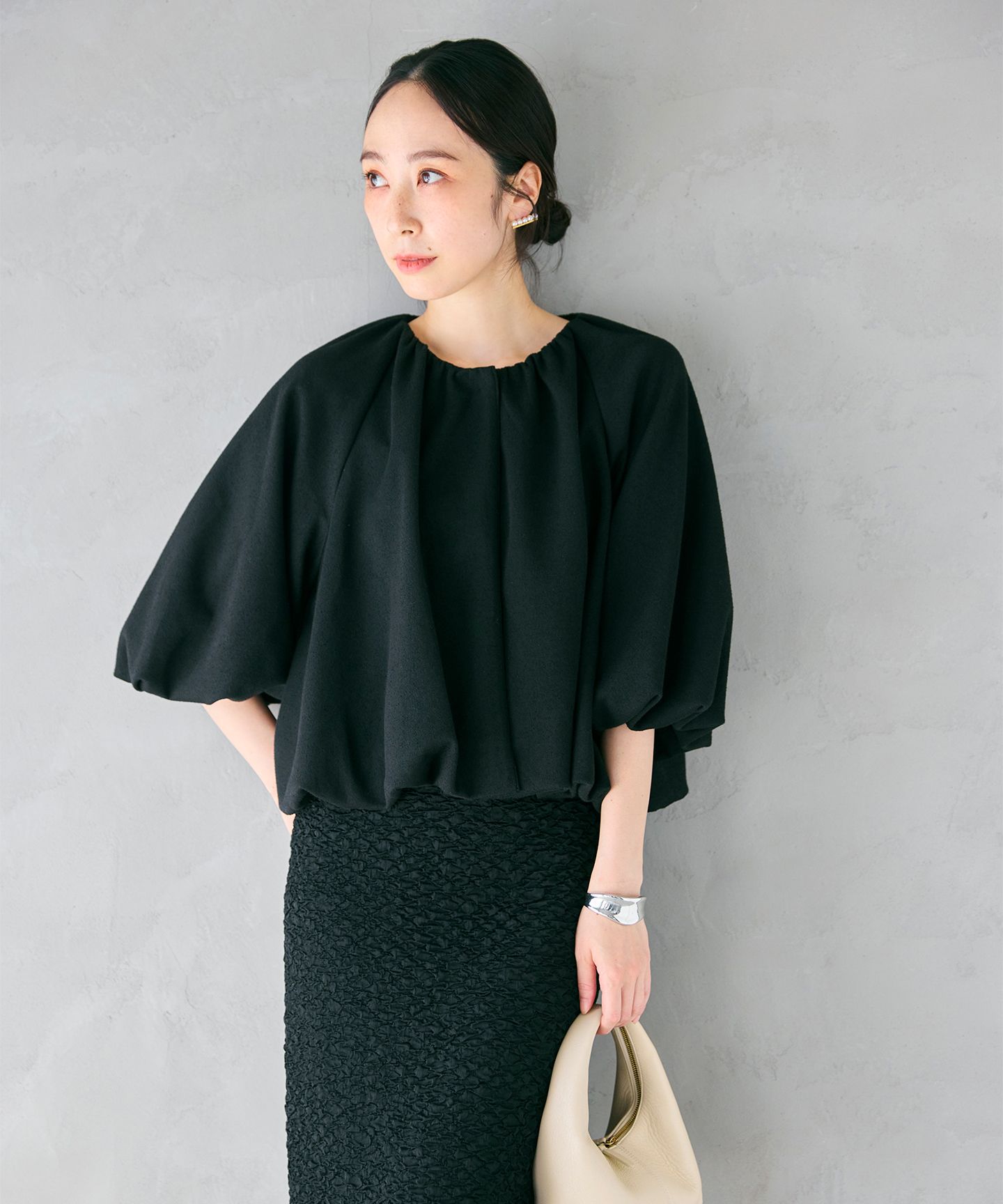 たっぷりのギャザーと、空気をまとうシルエットデザインたっぷりとギャザーを寄せたバルーンシルエットが印象的な七分袖カットソー。ラグランスリーブの切り替えによって、甘さのバランスの取れた一枚に。ふんわりとしたブークレ素材が、空気を含んだような軽やかさとやわらかさを演出します。前を閉じればブラウスのような上品さもあり、羽織としても、1枚着としても活躍する一着です。素材・所々にループのある糸を使用した、膨らみが でるように編んだカットソー素材・ループのある糸で編み上げた生地なので、表面に凹凸や粒感がある事が特徴・生地の陰影がありつつ、細かく編まれた素材で、シックな印象を持つ≫同シリーズアイテムはこちら※商品画像はサンプルを使用しているため、実際にお届けする商品と色味やサイズ等に若干の変更がある場合がございます。また、スタジオにより照明が異なるため商品の色味が異なって見える場合がございます。予めご了承ください。