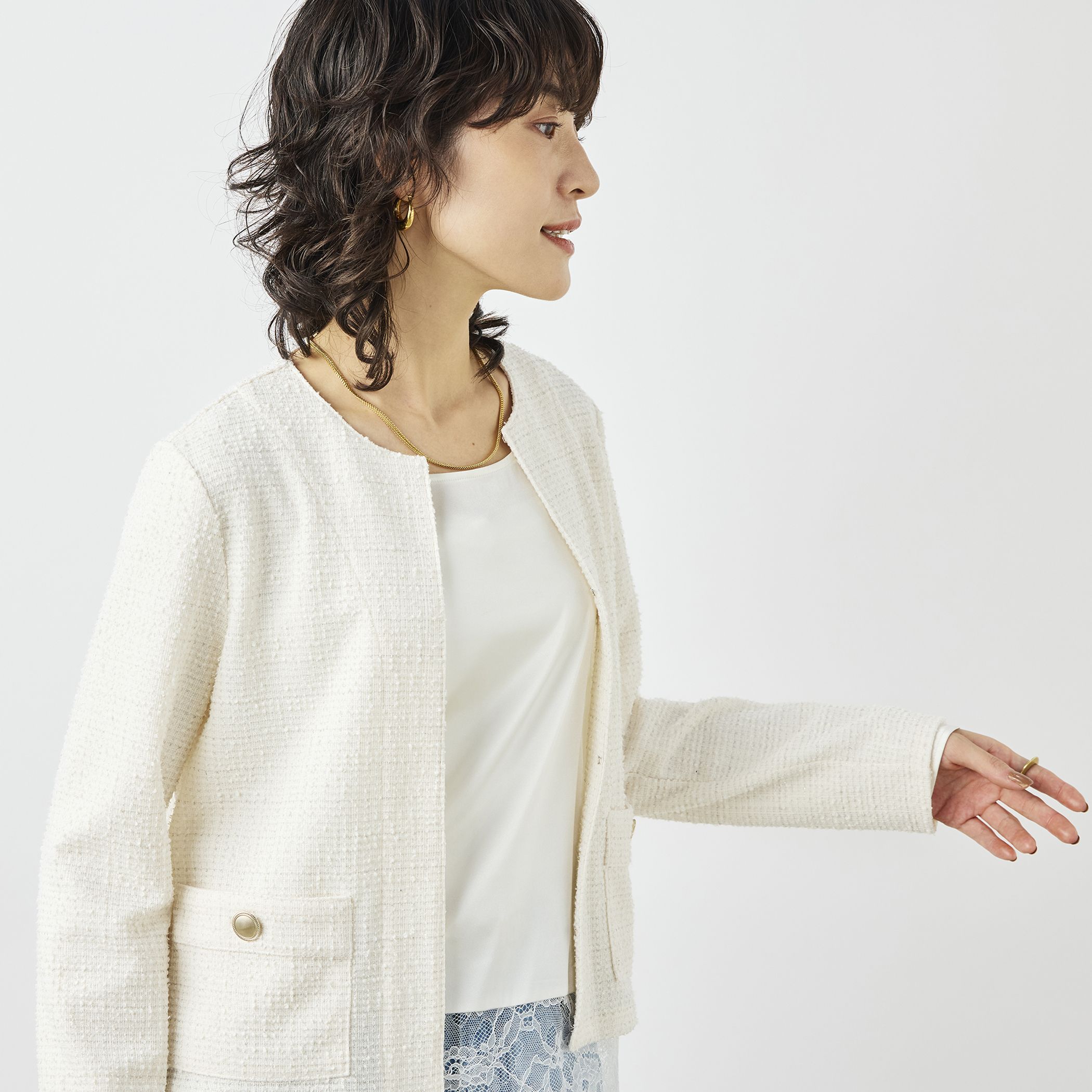 ◇26SS◇NOLLEYS◆Point・昨年も好評だったツィード見えのジャケットがリニューアルして今年も登場!・昨年より着丈を少し短くして、トレンドのレースインナーとのレイヤードスタイルも◎・ジャージならではの柔らかく軽い着心地・布帛のツィードジャケットほど硬くなく、カーデよりきちっとして見える羽織り・入卒園などのオケージョンからお食事会などのきちんとしたシーンに人気!・軽く柔らかい素材で、オフィスや室内での着用にぴったりの一枚・手洗い可●お取扱い上のご注意●末永くご愛用頂くために、アテンションタグを必ずご確認の上、着用又はお取り扱い下さい。気になる商品は、お気に入り登録がオススメです!クーポン情報、入荷情報が、通知されるようになります。※店頭及び屋外での撮影画像は、光の当たり具合で色味が違って見える場合があります。商品の色味は、スタジオ撮影の画像をご参照下さい。※商品画像に関しては出来る限り忠実に表示出来るよう努めておりますが、お客様がご利用のモニターの設定及び特性により、実際の商品と比較し色味に若干の誤差が生じる場合があります。※画像の商品はサンプルとなりますので実際の商品と仕様、加工、サイズが若干異なる場合がございます。