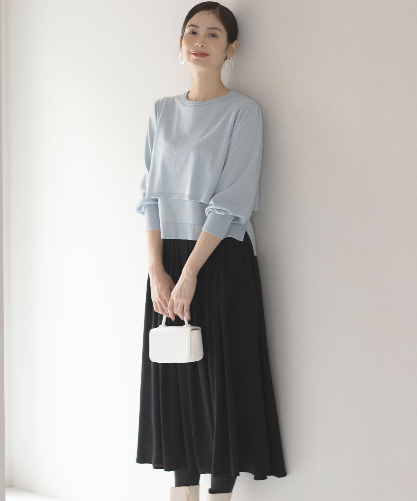 【WEB限定!HAPPY NEW YEAR セットアップ】1年の感謝を込めて、組曲から着回し自在のスペシャルなセットアップを数量限定でご用意致しました。簡単にスタイルアップ見えして華やぐ「きれいめセットアップ」をお見逃しなく!■デザインレイヤード風ニットと軽やかなマットサテンのギャザーボリュームスカートがセットになったアイテム。リラクシーな着心地ながら、メリハリがあってスタイルよく見せてくれるのは上下の素材が異なるセットアップならでは。忙しい朝もセットで着るだけで品よく華やいだ装いに。汎用性が高く、長いシーズン使えるアイテムを目指しました。ニット:クロップド丈のレイヤード風スタイルが1枚で叶うデザイン。タンクトップ型の同ニットを肩線でドッキングすることで重ね着風に見せているので、着膨れせずすっきり。アウトでの着用はもちろん、裾をスカートにインしたクロップドスタイルも楽しめます。肩のギャザーディテールや編立でボリュームを出した袖口など、シンプルながらニュアンス感のあるデザインに仕上げました。背面には小さめの飾りパール釦を配し、後ろ姿まで上品に。スカート:ライトなマットサテンのギャザーボリュームスカート。軽やかに揺れるシルエットがエレガントな印象を後押しします。デイリーに使いやすい絶妙なレングスで、ベルトにはゴムを使用しリラクシーなはき心地を約束。イージー見えしないよう、フロントベルト部分をフラットに仕上げたことで、ニットをインした際もきちんと感が出るデザインに。着回し度抜群のカラー展開も魅力です。■素材ニット:きれいな編地が特徴の梳毛糸で撚りを少し甘くすることにより柔らかく肌触りの良い糸を使用しています。ウールが少し入ることで上品な質感と温かみがあります。さらに極細のストレッチ糸をプレーティングしているので程よい伸縮性と強度が特徴です。今すぐ着られて春先まで重宝する素材感のニットです。スカート:軽く肌離れがよい柔らかくて上品なマットサテン生地を使用。シーズンレスに使える素材です。※撮影時の照明の関係により、色味が若干異なって見える場合がございます。実際にお届けする商品の色味はハンガー吊り画像をご参照ください。※画像はサンプルを使用しているため、実際にお届けする商品と色味やサイズ等の使用に変更がある場合がございます。予めご了承ください。【お買い物をより楽しんで頂くために】▼商品のお気に入り登録ハートマークをクリックし、お好きなカラーを選んでお気に入りに登録が完了!完売カラーの再入荷通知や、ラスト1点の通知、セールの通知も受け取ることができます。▼ブランドのお気に入り登録新商品や再入荷等、いち早くブランドのお得な情報を受け取ることができます。