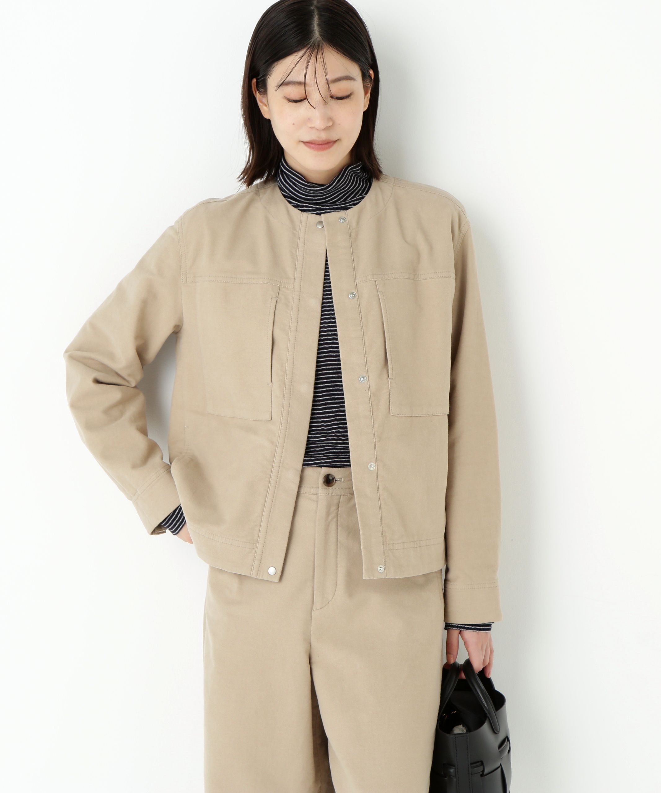 幅広いシーンで重宝するノーカラージャケット【デザインのポイント】大好評のストレッチポンチ素材を使用した、パールボタンが特徴のノーカラージャケットです。【素材のポイント】細番手の綿を使用しているのできれいな表情のストレッチポンチ素材です。しっかりとした肉感と適度なハリ感、ストレッチ感があります。【おすすめコーディネート】同素材シリーズのパンツとセットアップで着用していただくと、オケージョンやオフィススタイルにおすすめです。またデニムなどカジュアルアイテムとも相性がよく様々なシーンで活躍するジャケットです。透け感/なし|裏地/なし|光沢/なし|生地の厚さ/普通|伸縮性/ややあり|シルエット/スタンダード