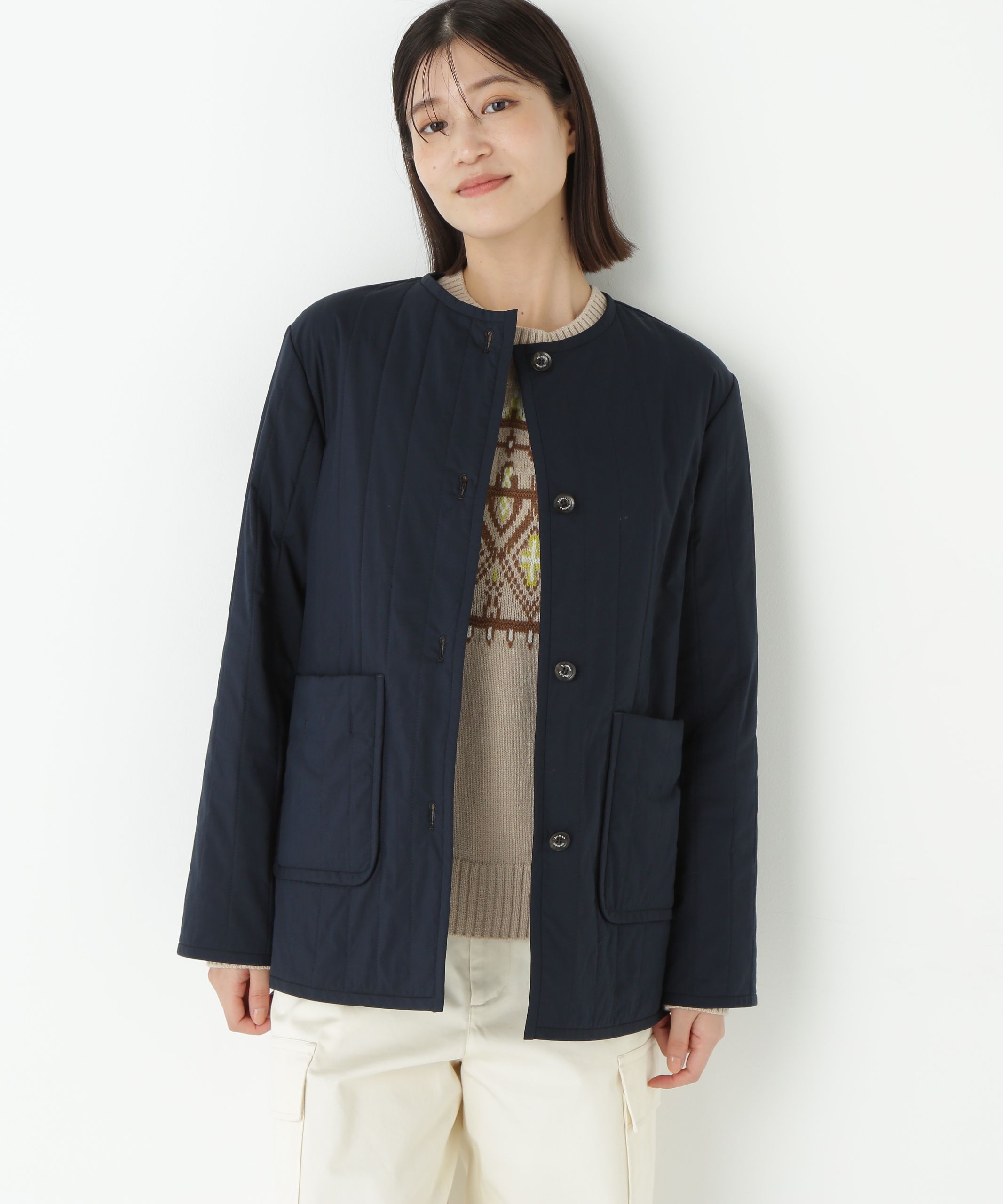 デイリーに活躍するキルティングジャケット【デザインのポイント】今年らしい縦目キルティングのノーカラージャケットです。トラッドなロゴ入り水牛調釦もポイントです。すっきりと共布の細めパイピング始末で仕上げています。【素材のポイント】キルティングの表側には適度なハリ感のライトなコットンナイロンタイプライター、裏側にはマットなPタフタのタータンチェックを使用しています。カポック混の中綿をサンドイッチしています。【おすすめコーディネート】カジュアルスタイルに欠かせない、一枚は持っていたいキルティングアウターです。季節が進むとコートインとして、ロングシーズン活躍します。ボトムを選ばないシルエットで着回しの効くジャケットです。透け感/なし|裏地/あり|光沢/なし|生地の厚さ/普通|伸縮性/なし|シルエット/スタンダード