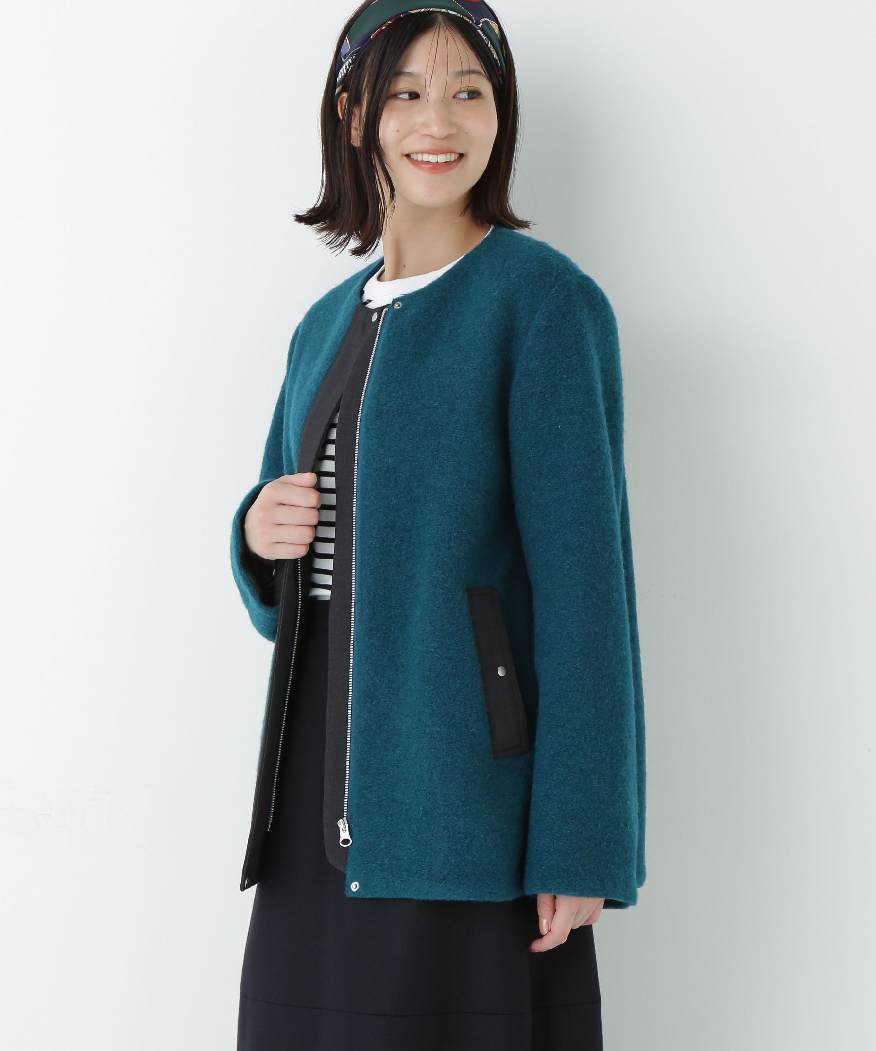 ふわりと軽く暖かい素材が人気のブルゾンがアップデート【デザインのポイント】クルーネックのスライバージャケットです。今期は前開きジップデザインでおつくりしています。前端・ポケット部分の別布使いもポイントです。【素材のポイント】スライバーとはイタリアで開発され、糸にしてから織るのではなく繊維をそのまま編み込んで作る特殊な製法で作られている素材です。空気を含みボリューム感があるのに軽いのも特徴です。別布には高級感あるポリエステル混ウールギャバを使用しています。【おすすめコーディネート】すっきりとした丈感で幅広いシルエットのボトムとバランスの取りやすいアウターです。透け感/なし|裏地/あり|光沢/なし|生地の厚さ/普通|伸縮性/ややあり|シルエット/スタンダード