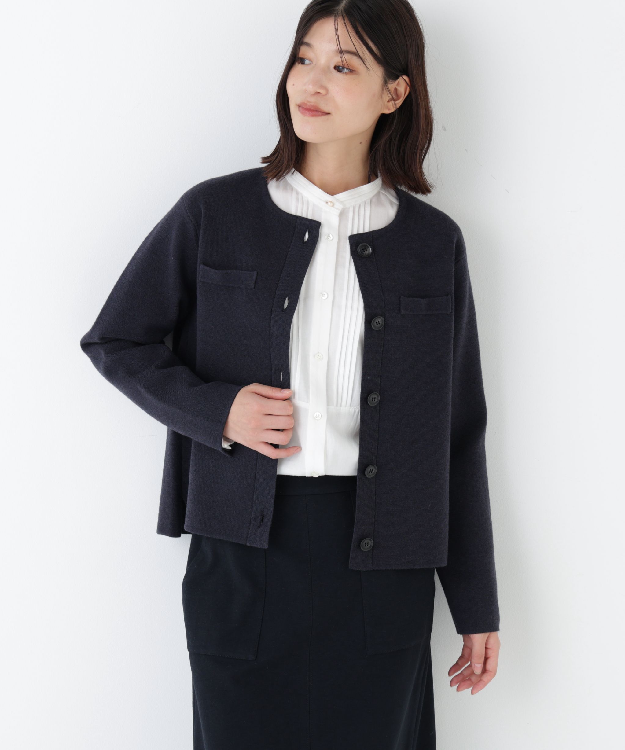 オンオフ問わず活躍するカーディガンライクなジャケット【デザインのポイント】クルーネックのカーディガン風ジャケットです。胸の飾りポケットや袖口のボタン開きがきちんと感を演出しています。丈の前後差やスリットなどで軽さを出しています。【素材のポイント】しっかりした編地でハリがあり型崩れの心配がありません。目面がきれいですっきりした見え感がキレイ目シーンでも活躍します。【おすすめコーディネート】コートインとしても使えるサイズ感でお作りしています。ボタンを留めたプルオーバーライクな着こなしもおすすめです。透け感/なし|裏地/なし|光沢/なし|生地の厚さ/普通|伸縮性/ややあり|シルエット/スタンダード