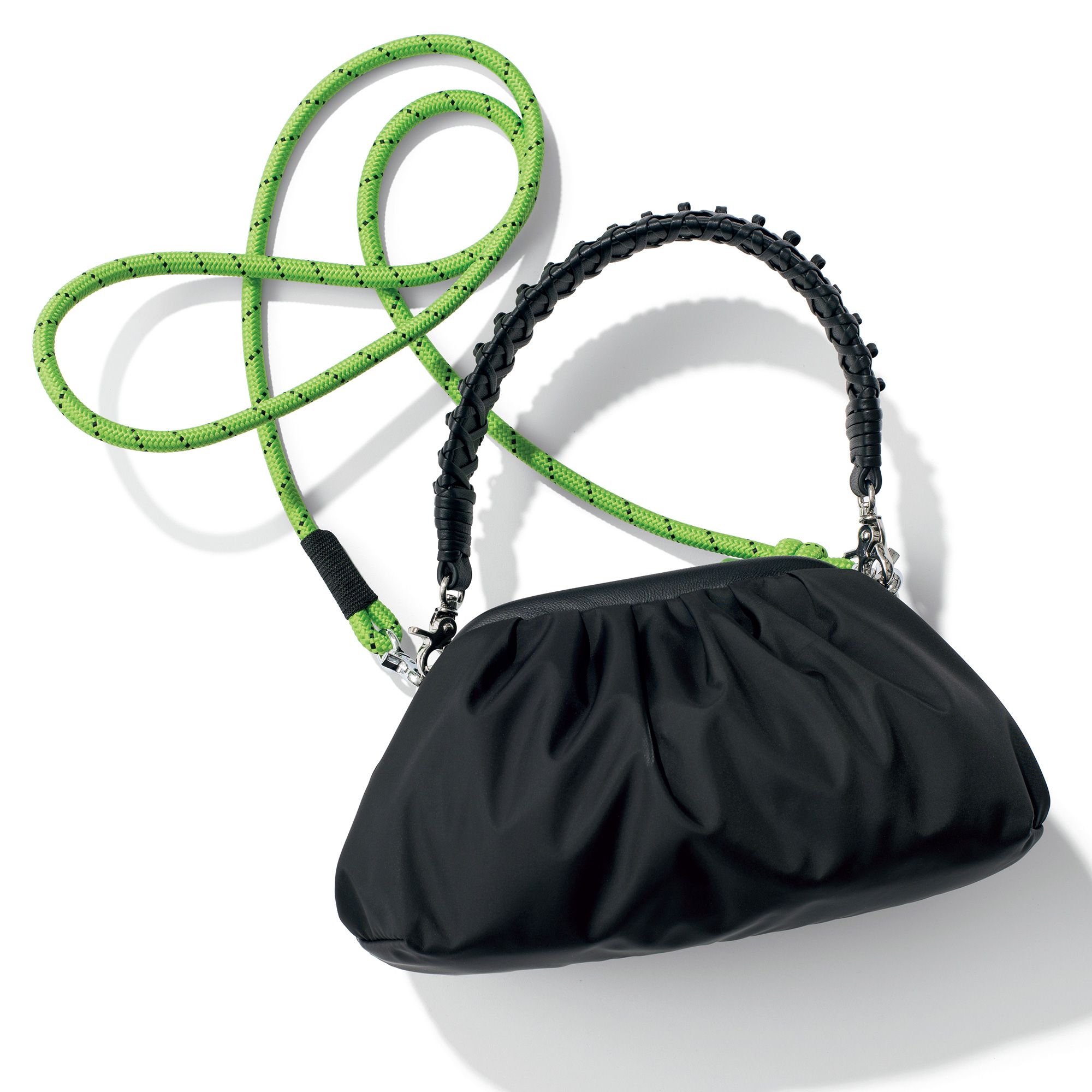餃子みたいな形がかわいいガバッと開くバッグ。タフタのように光沢あるナイロンで華やかな別注に。アクティブに持つために陽気な太パラコードもプラス。クラッチ、ハンド、斜めがけと顔を変えます。とにかく軽いし、見た目以上の収納力もいい!