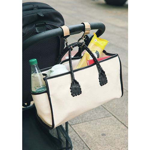 コットンキャンバス地にウレタンコーティングを施し、丈夫でいて軽量、撥水機能も備えたタフなバッグ。ハンドルやパイピングはリアルレザーで品よく、ホイップステッチと横長シルエットが感度の高さを演出。きちんと感もあるので仕事用にもママバッグとしても大活躍。長さ調節や取り外しが可能なショルダーや、保存用の不織布巾着もついています。