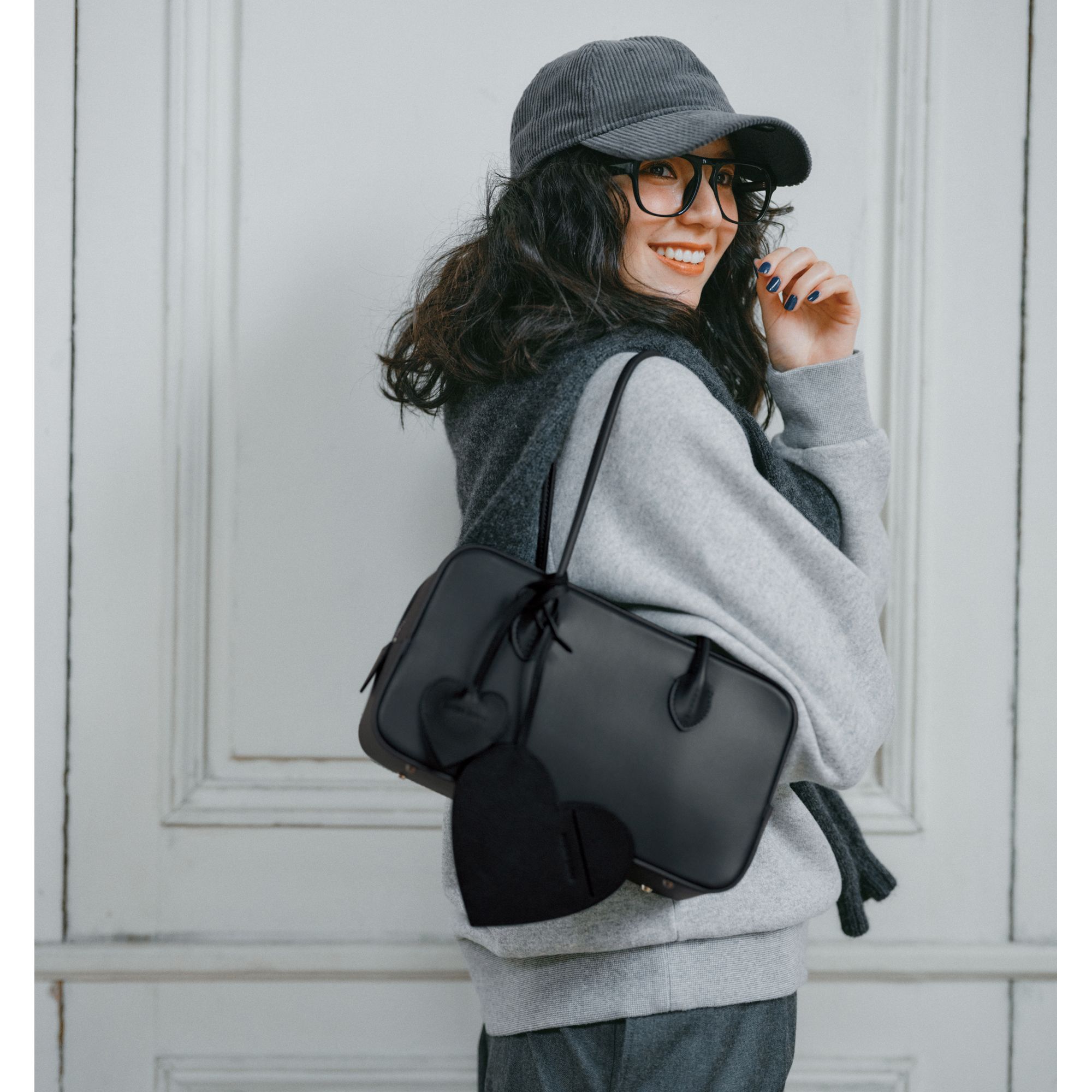 大人気ボックスボストンから、横長モデルをひとまわり小さくした新型が登場!しかもブランドのリリースに先駆けて、ハピプラストアでいち早くお披露目。シックなグレーにハートチャームを添えた、ここだけの特別仕様は見逃せません。持つだけで洒落て見えると評判のバッグは、イタリア仕立てのミニマルな美しさと緻密な縫製が魅力。別注色のグレーはブルーがかった絶妙な色味で、手持ちのワードローブをシックに格上げ。なめらかなすべり心地のイタリア製最高級ファスナーを採用。横までファスナーがガバッと開くから、中のものの出し入れもスムーズ。内装の生地は無染色のコットン( 綿)・ラミー(麻)素材。アクリルコーティングを施すことで汚れにくく。鍵などが入る便利な内ポケット付き。底鋲付きで地面に直接バッグが触れるのを防ぎ、擦れや汚れを防止。さらにバッグの安定性を高めて型崩れを防ぐ効果も。大きめハートはパスケース、小さめハートはキーチャームに。どちらもシュリンクレザーを使用し、さりげないロゴの刻印が上品なアクセントに。
