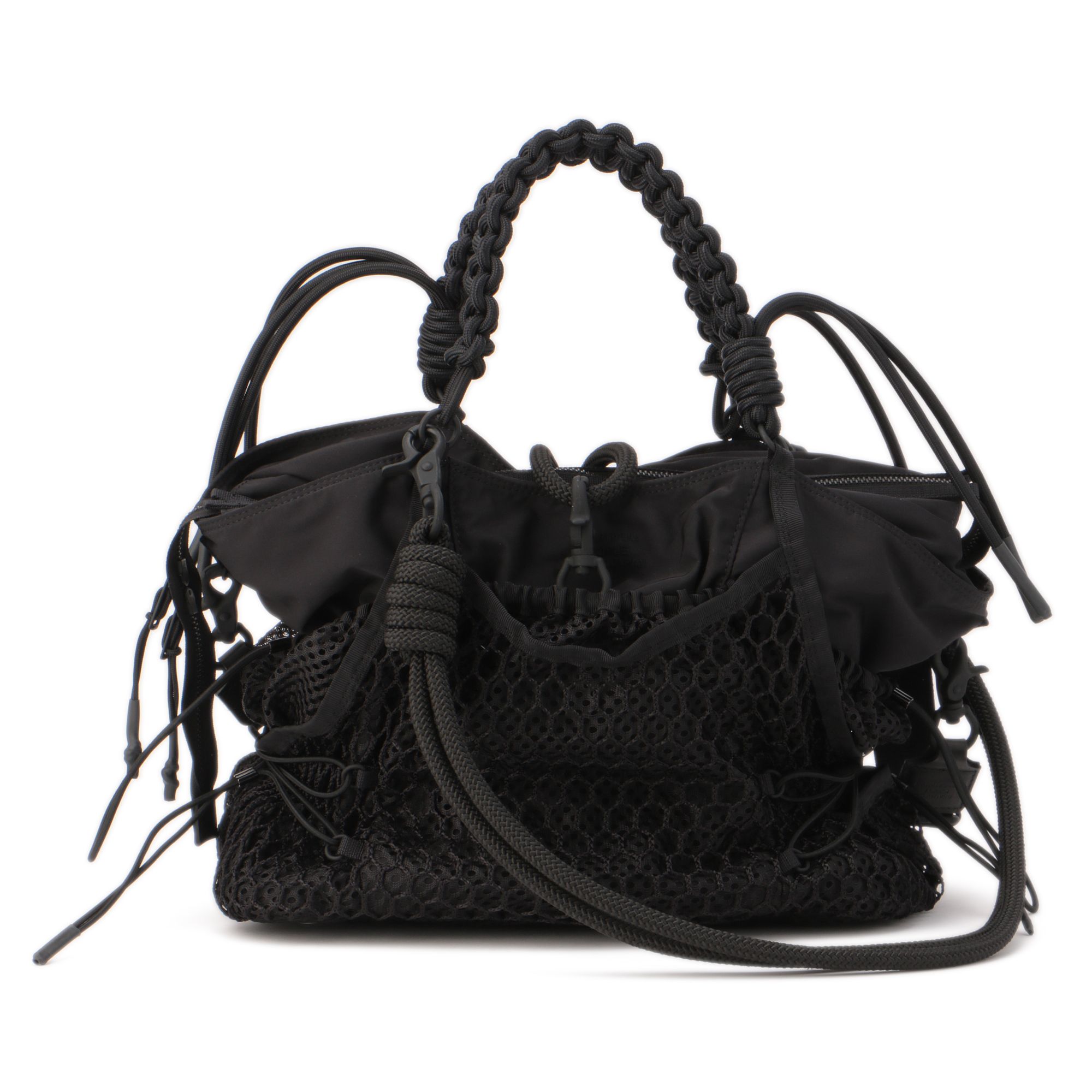 ハンドクラフトで編み込んだハンドルや、ノットディテールが特徴的な2WAYショルダー。取り外し可能なストラップ付きで、重なるメッシュ使いがスポーティーな印象も。内側にはジップポケットと仕切りポケットを配し、デイリーからアクティブシーンまで活躍します。