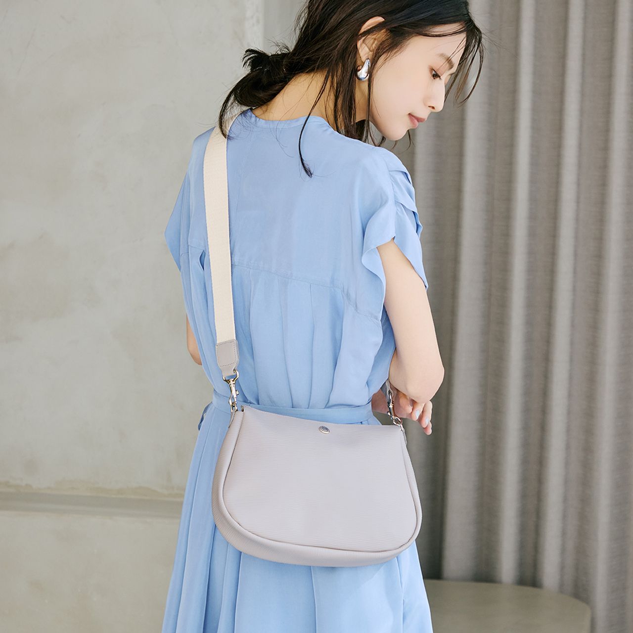 丸みのある優美なフォルムがこなれたムードを演出するショルダーバッグが仲間入りです。スリムなボディながらも、スマートフォンや長財布など、最低限の荷物が十分収まるちょうど良いサイジング。ストラップの長さはハンドバッグ〜斜め掛けまで調整ができ、その日のコーディネートに合わせて変幻自在なのもうれしいポイント。デイリーにはもちろん、旅行などのアクティブなシーンにも便利な逸品です。リプル…PVCにさざ波のような型押しを施した、クールな表情が人気のシリーズ。傷や汚れが目立ちにくく軽量で、デイリーユースに最適。※商品画像はサンプルのため、色味やサイズ、仕様等に変更が生じる場合がございますので、予めご了承ください。