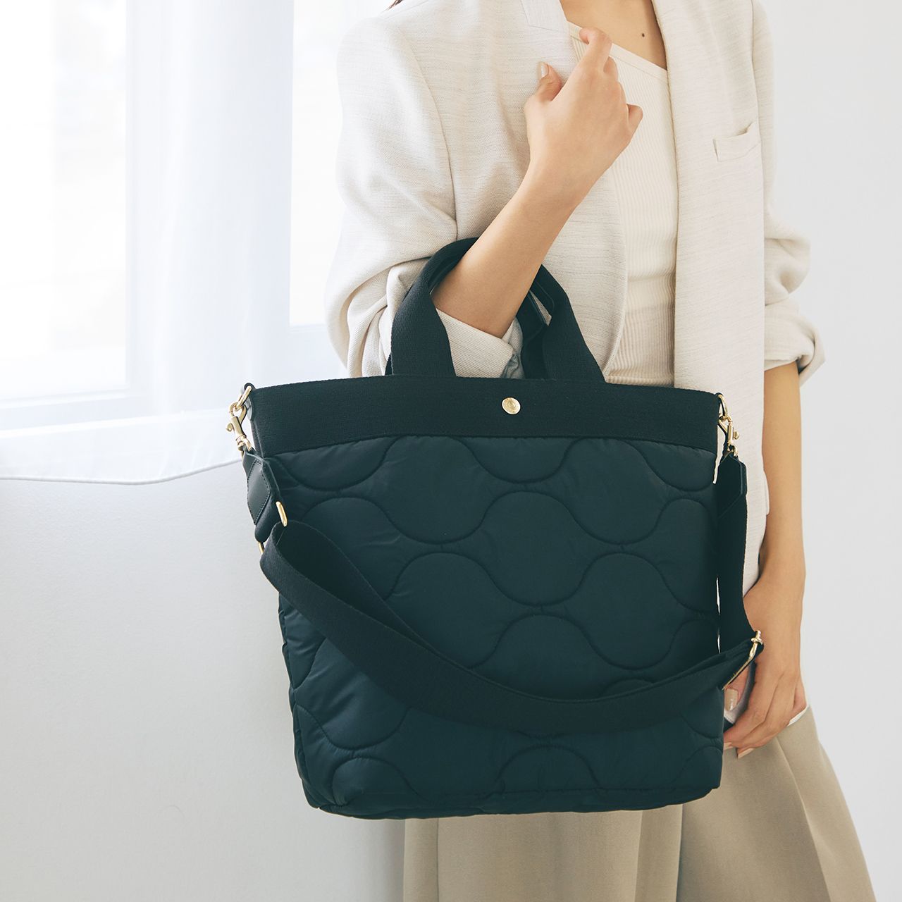 <リクエストにお応えし、大人カジュアルを格上げするキルティングトートが復刻>軽さはそのままに、ファスナー付きの内ポケットやレザーのネームタグなどディティールをアップデートしました。ボディは撥水加工を施したリサイクルナイロンの生地に、カジュアルな表情を加える波型のキルティング。実用性に優れた縦長トートはA4サイズもすっぽり入り、取り外し可能なショルダーベルト付きで肩掛けや斜め掛けも叶えます。取り入れるだけで季節感を添える、大人カジュアルのワンアクセント。【注意事項】・素材の特性上、衣類等の色がバッグ本体に移る可能性がございます。・湿った状態での摩擦や、水や雨、汗などで濡れた状態では特にご注意ください。・雨などで濡れた場合は、乾いた布で出来るだけ水分を取って下さい。染みやカビの原因になります。・天然皮革を使用している場合、表面に天然皮革特有のシワやシボが入る場合がございます。素材の特性としてご了承下さい。・PVC素材の場合、梱包方法や素材の特性上、しわや凹凸が出る場合がございますが使用と共に目立たなくなります。気になる場合には、室内等の暖かい場所で、底板と荷物などを入れた状態で平らな場所にしばらく置いて頂きますと、しわが目立たなくなります。・金具を使用している場合、金具部分は保管環境や使用状況により変色などが起こる場合がございます。