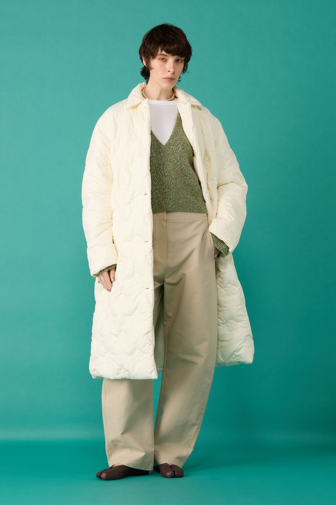 オンオフの幅広いシーンに投入できる、ジャカードニットのポロシャツ。深みのあるカラーと、同色系の控えめなアーガイル柄に大人っぽさが漂います。注目したいのが、「GANNI」おなじみのバタフライ金具と胸元のロゴ刺繍。長めの袖を少したくし上げると、 より今年らしく仕上がります。