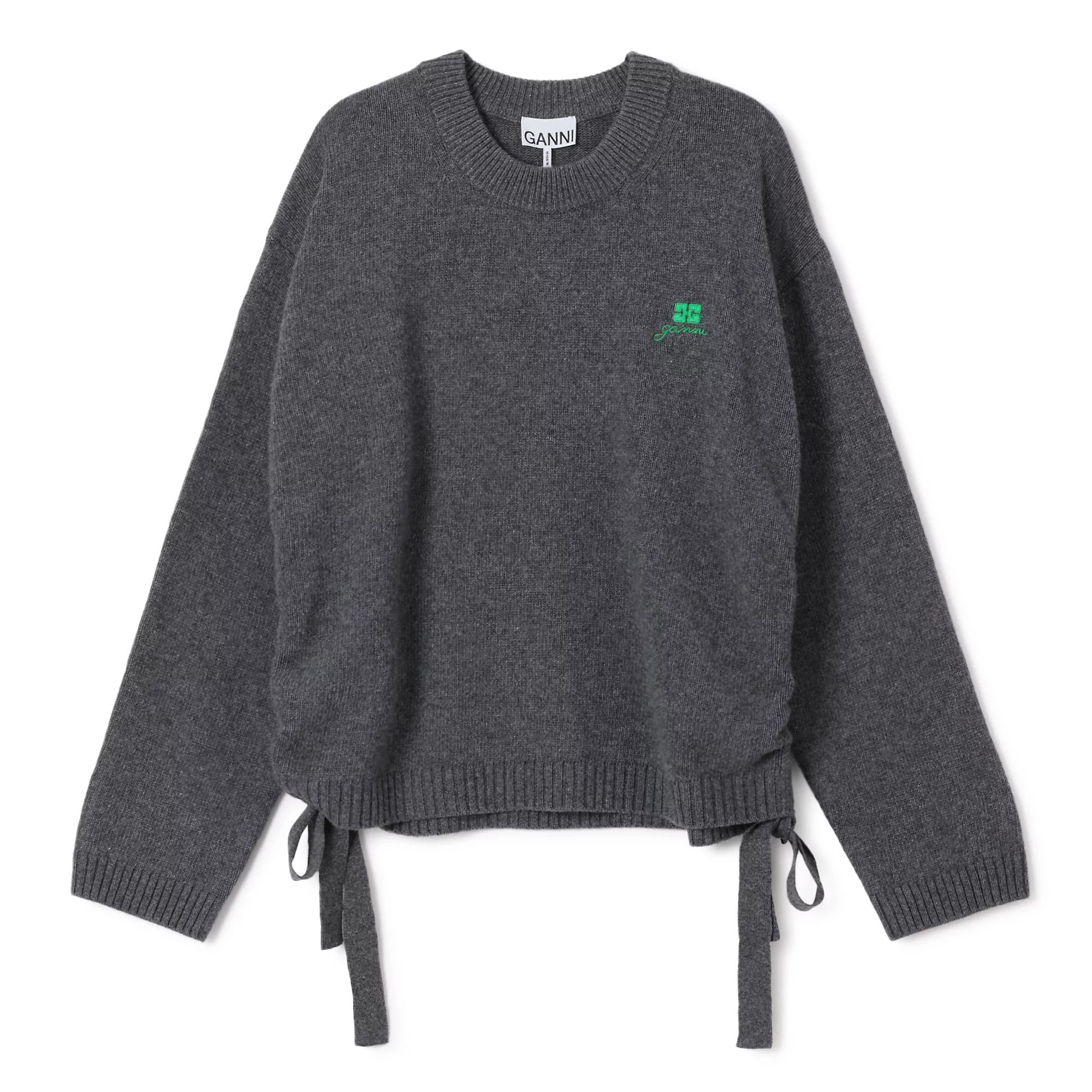 サイドのドローコードでシルエット変化も楽しめるクルーネックニット。胸元には「GANNI」のロゴ刺繍をあしらい、飽きのこないシンプルさ。ゆるめのネックラインからINを覗かせたりと、抜け感たっぷりに着こなせる一枚。