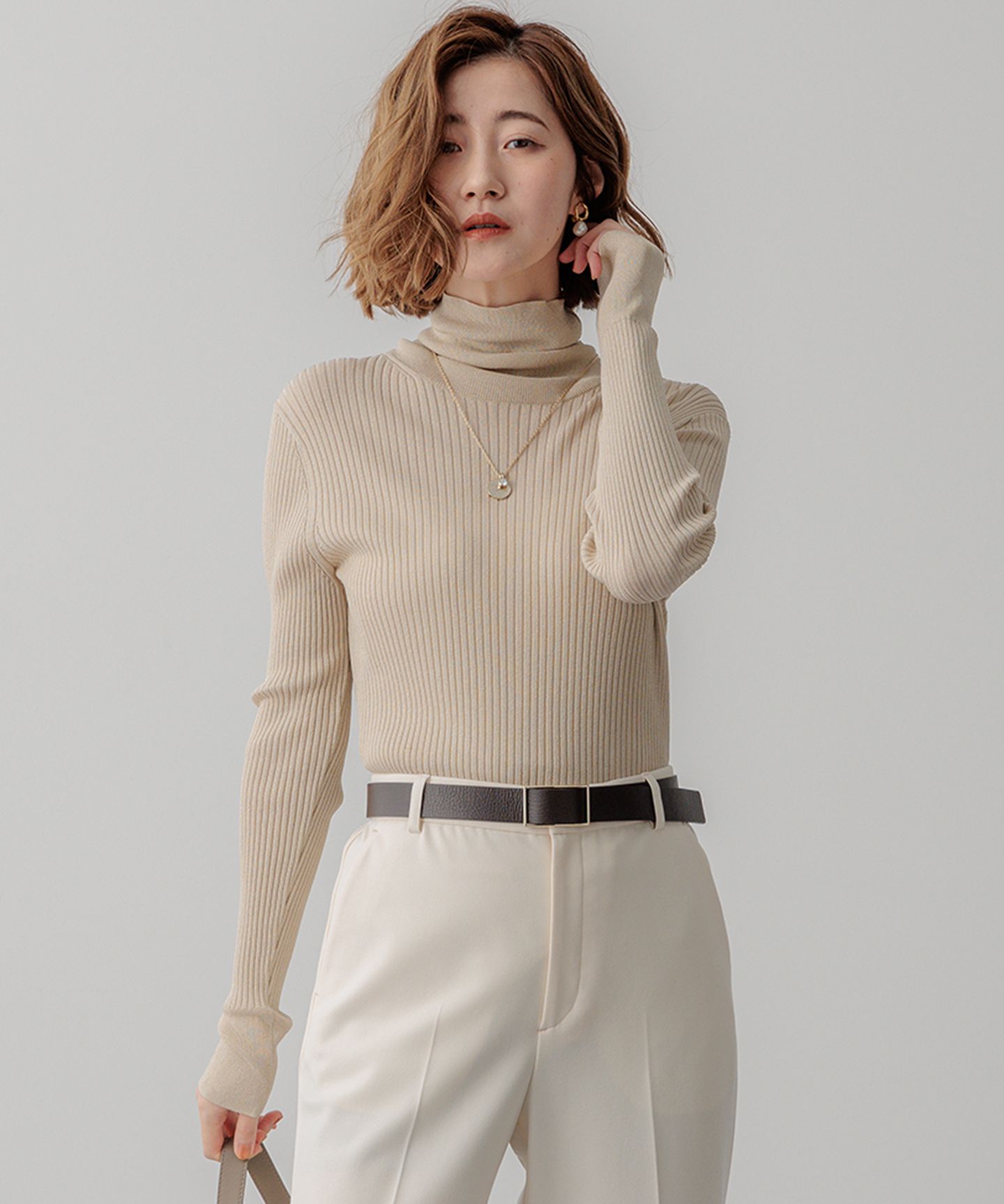 2024 Autumn & Winter薄手でさまざまなアイテムとのレイヤードが楽しめるラメニット■デザインワイドリブベースのタートルニット。一枚着でもレイヤードでも着回せる便利アイテムです。華やかなラメの光沢と気負わず着られる程よい透け感でトレンド気分を味わえます。カラーは、ベーシックなブラック(#005)、華やかさがアップするゴールド(#090)とシルバー(#091)の3色展開です。■素材清涼感があるヴィスコース糸に同色系のラメを撚糸した端境期に適したシーズンレス素材です。程よいストレッチ性があり適度な透け感で女性らしい上品な雰囲気に仕上がります。※画像はサンプルを使用している為、実際にお届けする商品と仕様が異なる場合がございます。