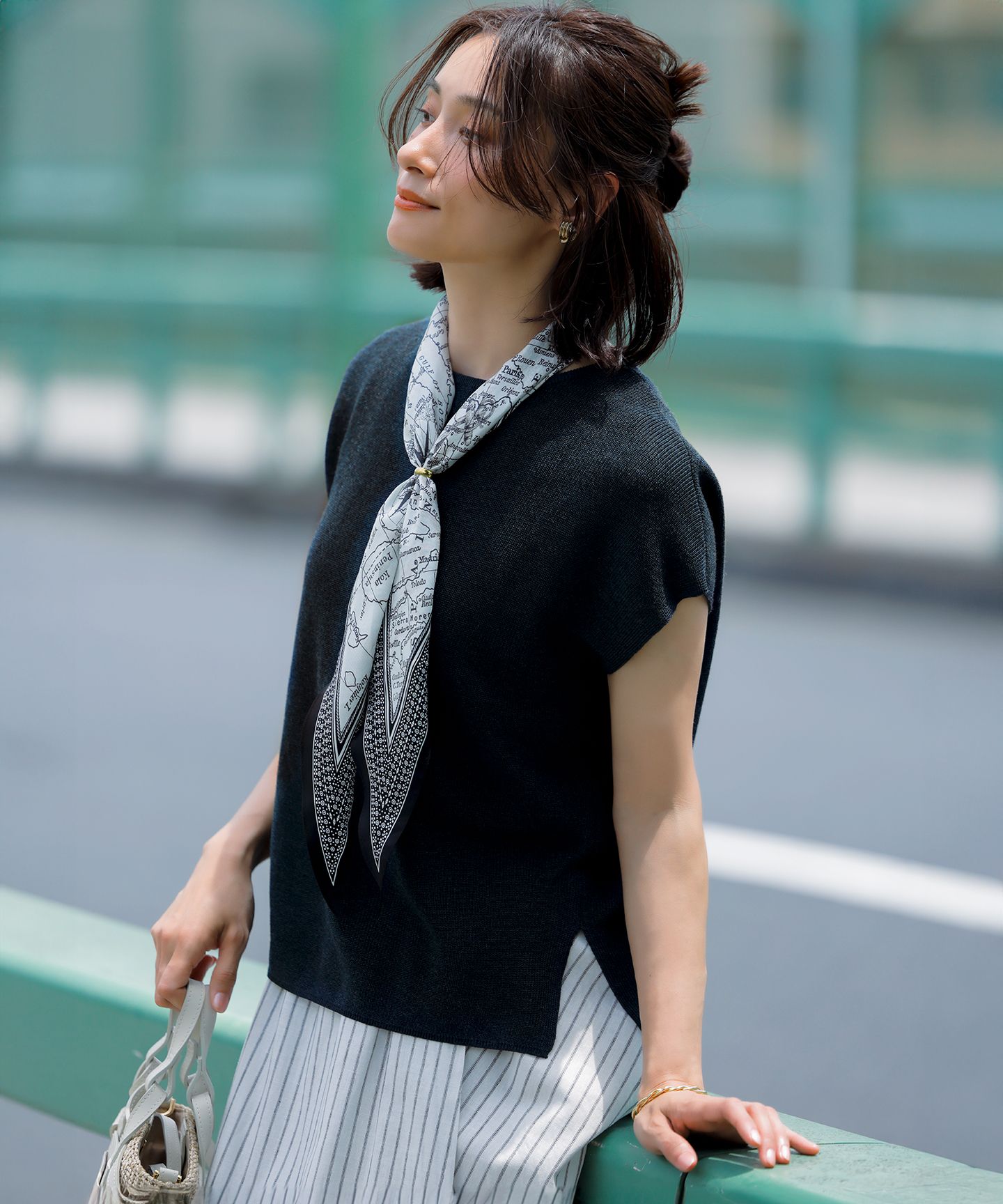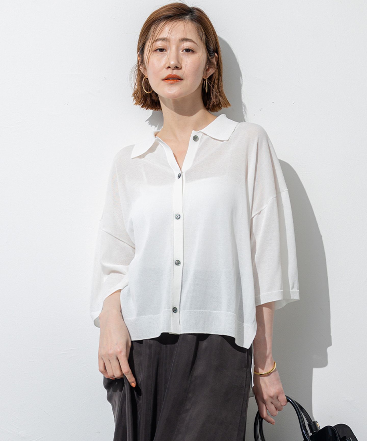 2025 Spring & SummerSLOW 23区スローな1日に纏うものは、快適で美しいものがいい。安らぎを与えてくれる素材と仕立てで、気張らず自由におしゃれを楽しめるカジュアルウェア。ゆったりしたオフボディーのサイズ感のシアーニット。ゆるめのシルエットと深いサイドスリットで、より軽やかなスタイリングに。プルオーパーとしてももちろん、シャツ風にも、羽織りとしても着用でき、コーディネイトの幅が広がります。前後にレングス差をつけており、ヒップも自然にカバーしてくれます。爽やかなホワイト系(#001)、シックなブラック系(#005)の2色展開です■素材説明綿をポリエステルでダブルカバーしたやや強撚タイプの糸を使用しています。綿の風合いも感じられ、シャリ感のあるドライタッチな手触りで汗ばむ季節にちょうどいい素材。洗濯後の形態安定性にも優れておりピリング(毛玉)になりにくい素材です。■同シリーズシアーサマー リブ カーディガン(品番:KRSWGM0961)※画像はサンプルを使用している為、実際にお届けする商品と仕様が異なる場合がございます。