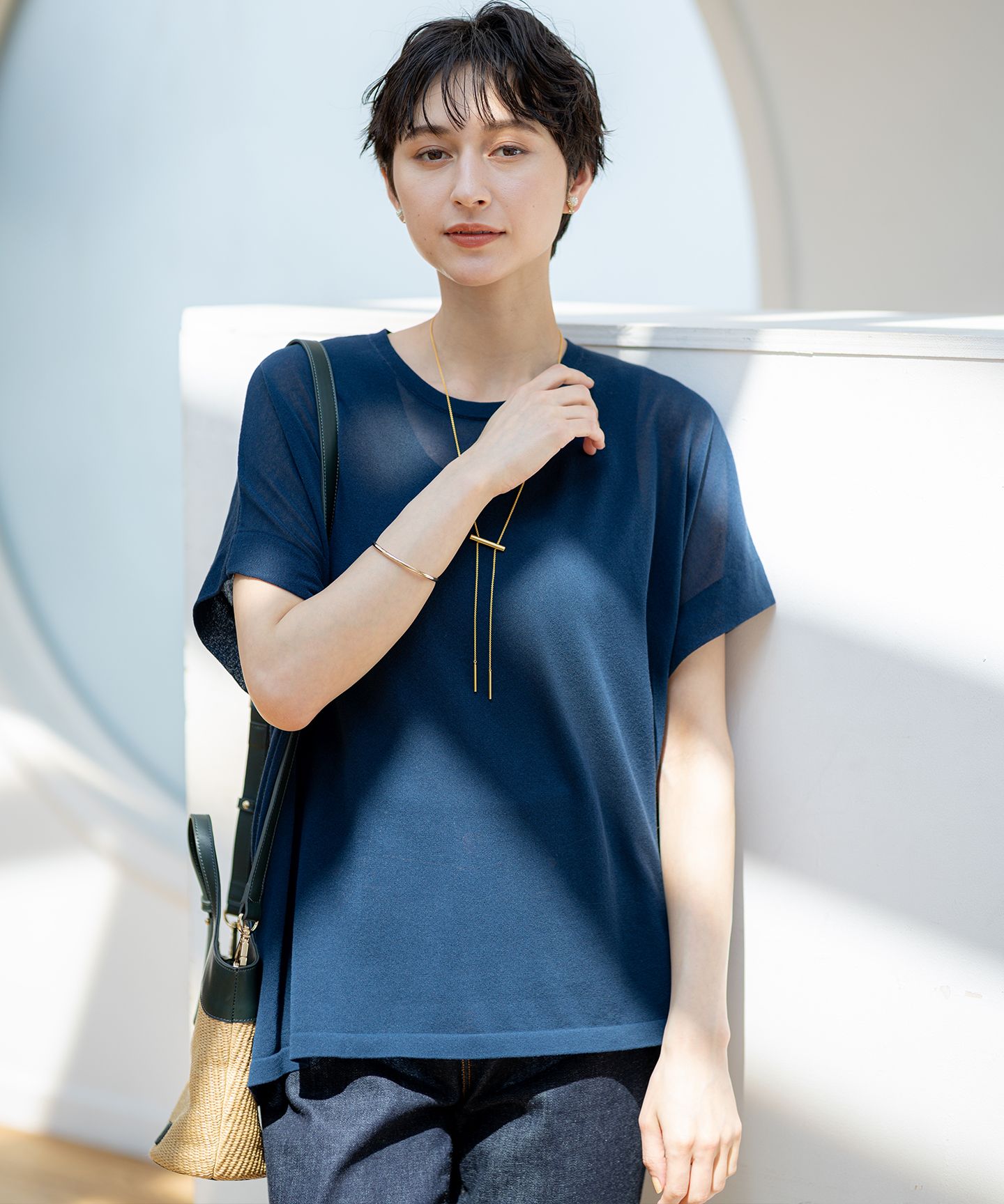 2025 Spring & Summer肌離れの良い涼やか素材で夏でもさらりと着られるニット■デザイン真夏に嬉しいリラクシーサイズのプルオーバー。タック袖のフォルム感が気になる二の腕をすっきりカバーし、オフボディのシルエットで見た目も着心地も清涼感抜群です。程よくシアーな軽い素材感で大人カジュアルが快適に決まる、夏にぴったりな一枚。カラーは印象引き締まるブラック(#005)、明るい雰囲気のライトオレンジ(#022)、抜け感のあるダークブラウン(#035)、ニュアンス感のあるモスグリーン(#053)、洗練された印象のダークブルー(#065)の5色展開です。■素材ハイツイストに撚糸したインド長綿にツヤのあるブライトナイロンをカバーリングした素材です。透けすぎない絶妙なシアー感がとても軽やかです。毛羽立ちが抑えられシャリ感のある肌ざわりで発色性に優れ、盛夏にぴったりな風合いに仕上げました。■同シリーズライトシアーニット ブルゾン(品番:KRWOGM0651)※画像はサンプルを使用している為、実際にお届けする商品と仕様が異なる場合がございます。
