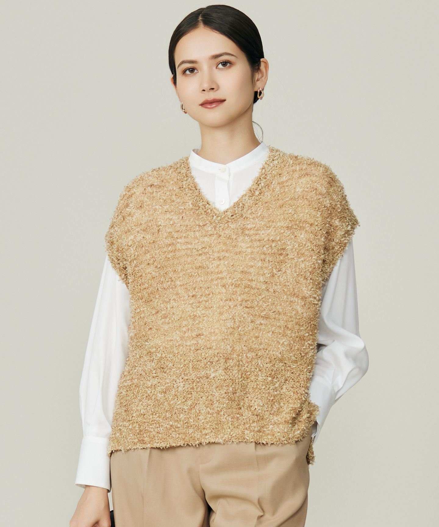 様々なスタイリングが楽しめる華やかなニット■デザインきらりと光るラメが華やかなニットです。レイヤードアイテムとしてだけでなく、レングスバランスや襟の開き具合、肩回りのシルエットなどの細部にこだわって、単品でも着て頂けるようにお作りしました。■素材テープ状の不織布ナイロンとラメの入ったモールヤーンをミックスし、独特の凹凸感を表現したファンシーヤーンです。暑い時期にもおすすめな、軽やかで膨らみのある、パッと見た目のキャッチーな素材です。※画像はサンプルを使用している為、実際にお届けする商品と仕様、加工、サイズが若干異なる場合がございます。予めご了承ください。※撮影環境の都合上、実際の商品と色味が異なって見える場合がございます。