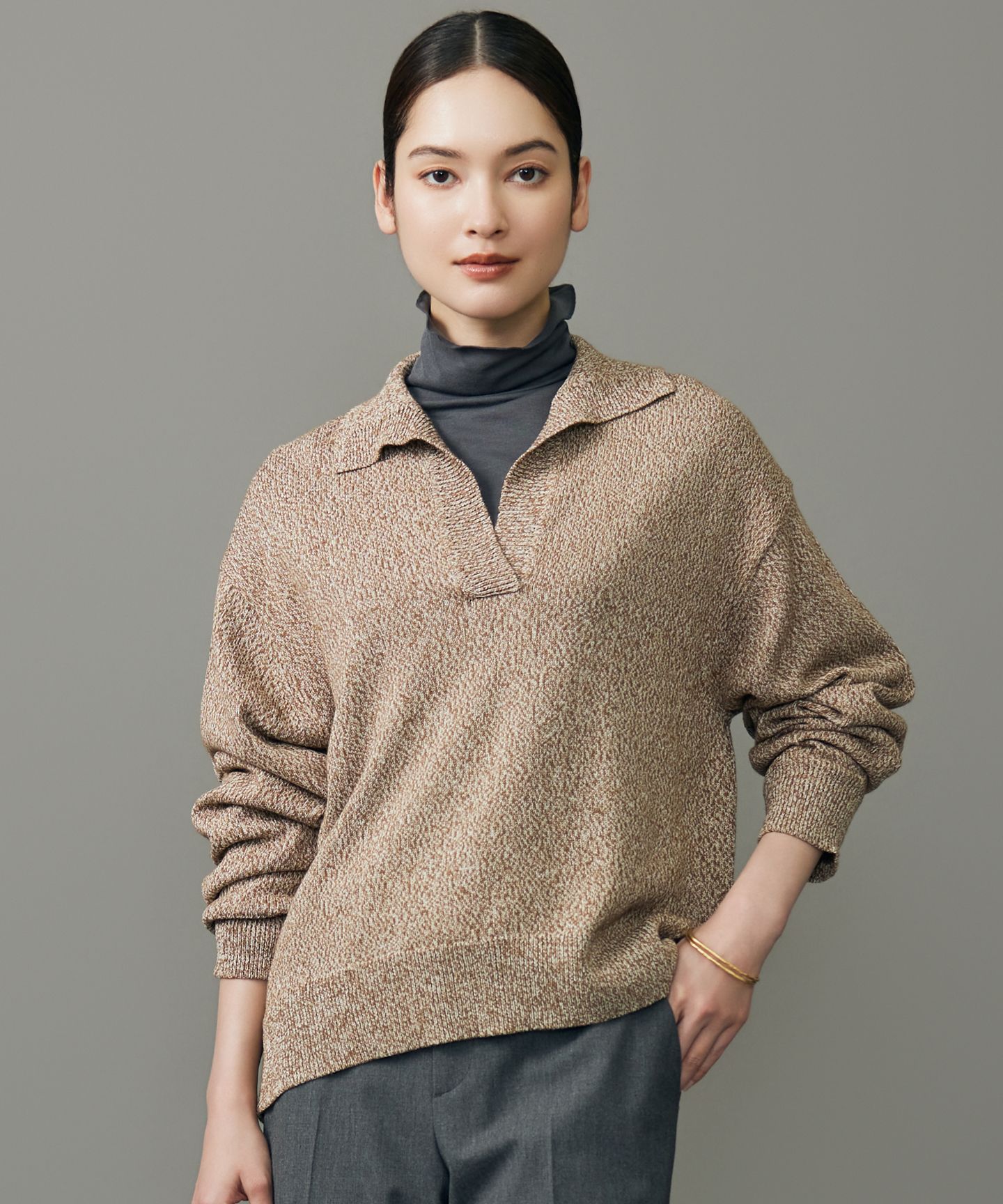 開いた襟がポイントのシャリ感のあるニット■デザイントレンドアイテムである襟付きのニットです。袖はやや膨らみのあるデザインになっています。襟周りのデザインと袖に膨らみを持たせることで、1枚でも決まるアイテムです。タートルのインナーなどを合わせたコーディネートもおすすめです。■素材メリノウールの原毛にコットンをブレンドした混紡糸です。梳毛のようなすっきりとした糸ですが、紡毛のようなふくらみ感と軽さも表現しているセミ梳毛糸となります。ウールにはマーセライズ加工が施されており、しなやかでソフトな印象で、光沢感もあります。生産の工程1つ1つをゆっくりと時間をかけて行うことで、色の均一性が非常に保たれ、柔らかく膨らみ感のある糸となります。このようなコットンウール素材に紙繊維を2色のカラーで撚糸して、シャリっとしたドライタッチのカラーミックス杢に仕上げています。※画像はサンプルを使用している為、実際にお届けする商品と仕様、加工、サイズが若干異なる場合がございます。予めご了承ください。※撮影環境の都合上、実際の商品と色味が異なって見える場合がございます。