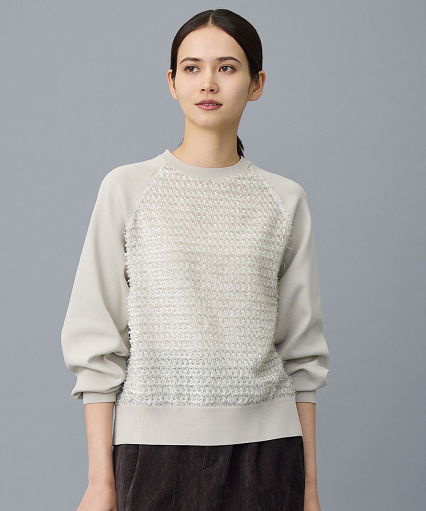 ファンシーで表情のある糸と繊細なラメ糸が目を惹くニット■デザイン糸のユニークさを前面に打ち出したシンプルなデザインのニットです。スカートやワイドボトムと相性の良いコンパクトなシルエットに仕上げました。袖ぐり周りなどは程よく緩さをつけることで、抜け感のあるデザインになっています。■素材2色のループ糸とモール調のラメ糸を撚糸することでオリジナリティーがあり、ファンシーで迫力のある表情が特徴です。コシとストレッチ性があるため、春に適した程よい厚みのあるミドルゲージ素材です。※画像はサンプルを使用している為、実際にお届けする商品と仕様、加工、サイズが若干異なる場合がございます。予めご了承ください。※撮影環境の都合上、実際の商品と色味が異なって見える場合がございます。