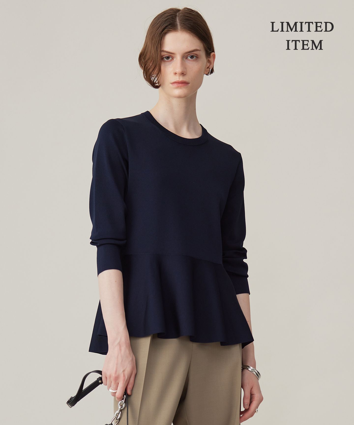 2024AW立体的な美シルエットでワンランク上のスタイリングが叶うペプラムニット■デザインペプラムシルエットが目を惹くニットプルオーバー。ダブル組織で編み立て、適度な肉感とハリコシがあり腰回りをカバーしながらも、すっきりとしたバランスで美シルエットが叶います。一枚着はもちろん、ジャケットINにも便利なアイテムです。■素材しなやかなアセテートとポリエステルを撚り合わせた適度なハリコシと膨らみ、清涼感を合わせ持った素材に、極細のポリエステル糸を一緒に編みこむことで、伸縮性や軽量感、スポンディッシュな膨らみをプラスし、上品でエレガントな表面感はそのままに、それぞれの素材の持つ特徴が最大限に生かされたハイブリッドでコンフォータブルな素材です。※商品の取り扱い方法につきましては、タグ等に記載されている「取り扱い上の注意」「洗濯表示」をご確認ください。※採寸情報はサンプル商品のデータです。実際の商品と仕様が異なる場合がございます。※商品画像はサンプルを使用しているため、実際にお届けする商品と色味やサイズなどの仕様に変更がある場合がございます。予めご了承ください。