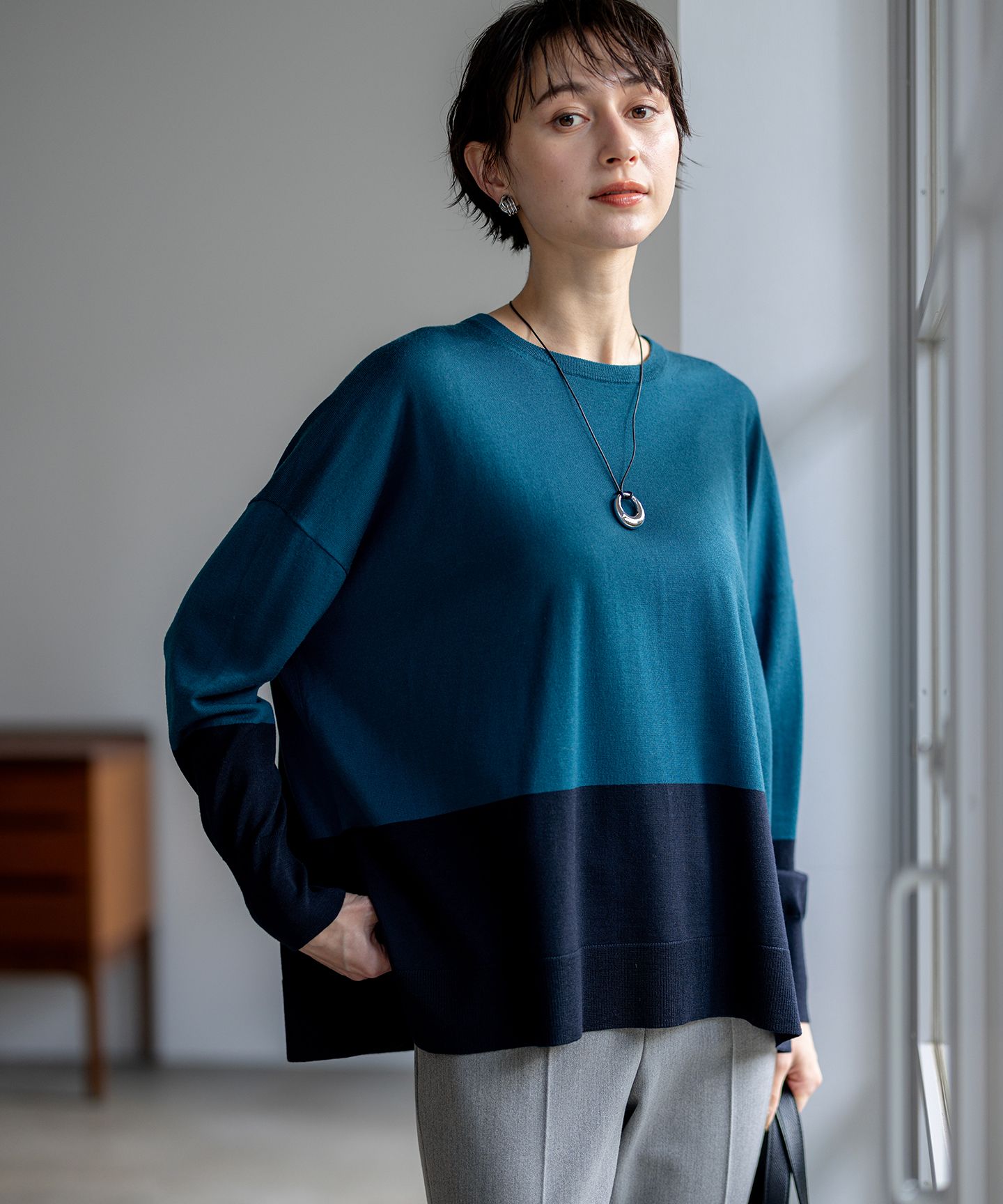 2025 Autumn & Winter女性らしさと抜け感を演出するニットチュニック■デザインゆったりとしたシルエットながら、女性らしい柔らかなドレープ感が魅力のチュニックプルオーバーです。襟と袖口には同色系のふっくらとしたバルキーリブをあしらい、洗練された印象を与えます。ラグランラインは、圧縮加工でフェルト化した素材の特性を活かし、あえて縫い目を表に出すシームアウト仕様に。ボディラインを拾わないオーバーサイズでありながら、軽やかな着心地で、大人のカジュアルスタイルを上品に格上げしてくれます。さりげなく配された袖ポケットも、遊び心のある可愛らしいアクセントです。細身のパンツやレギンスと合わせてすっきりと、またロングスカートと合わせてリラックス感のある着こなしもおすすめです。カラーは、上品で合わせやすい定番のグレー(#004)、やわらかく女性らしい印象を与える新色のベージュ(#033)、深みがありシックで落ち着いたダークブラウン(#035)、知的で洗練された印象を与える万能なネイビー(#075)の4色展開です。■素材上質な細いウール糸を丁寧に圧縮(ボイルド)加工し、まるでフェルトのようななめらかな質感に仕上げた素材をベースに、ふっくらとした厚みのあるバルキーリブを組み合わせました。細いウール糸を使用することで、圧縮加工を施しても硬くならず、柔らかな肌触りと、ニットならではの豊かな膨らみをキープしています。心地よい伸縮性がありながら、優れた保温性も兼ね備えているため、寒い季節も暖かく快適にお過ごしいただけます。ベースのボイルドウール素材と、表情豊かなバルキーリブのコントラストが、23区らしい天然素材へのこだわりと洗練されたデザイン性を感じさせます。▼同シリーズボイルドウールコンビ ジップ タートルニット(品番:KRWOGW0562)※画像はサンプルを使用している為、実際にお届けする商品と仕様が異なる場合がございます。