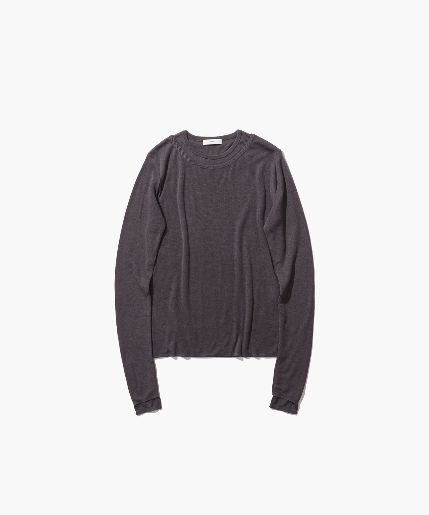■DESIGNシンプルなクルーネックにタンクトップをレイヤードしたデザインのプルオーバー。透けすぎると気になる下着部分はしっかりとカバーしてくれます。脇・裾にハギが無いため裏返してもまた違う表情を楽しめます。■MATERIALレーヨンとシルクをブレンドした綿をドライでソフトなタッチに仕上げた糸を使用しています。特殊な紡績方法によりレーヨン特有の毛羽立ちを無くし、品のある艶感と綺麗な目面感、最高の肌触りの良さを持ち合わせたATONオリジナル素材です。また、ベントレー社の古くからある編み機を使用し、ニットの良さである編み出しと、ジャージーの良さであるキックバックの良さ、身頃にハギのできない特徴を兼ね備えた、インナーに最適な方法で作られています。国内外探しても非常に台数の少ない特殊な編み機である上、設計に技術が必要とされる為、動かせる職人さんもほとんどいない現状があります。国内ではなく海外で製品を作る1番のメリットは、カットソーではなく、ニットの縫製ができる点です。より着心地も良く、カジュアルにならない価値感のあるアイテムです。TENCEL SILK CIRCULER RIB | タートルネックセーターTENCEL SILK CIRCULER RIB | ヘンリーネックセーターTENCEL SILK CIRCULER RIB | クルー&クルーレイヤード