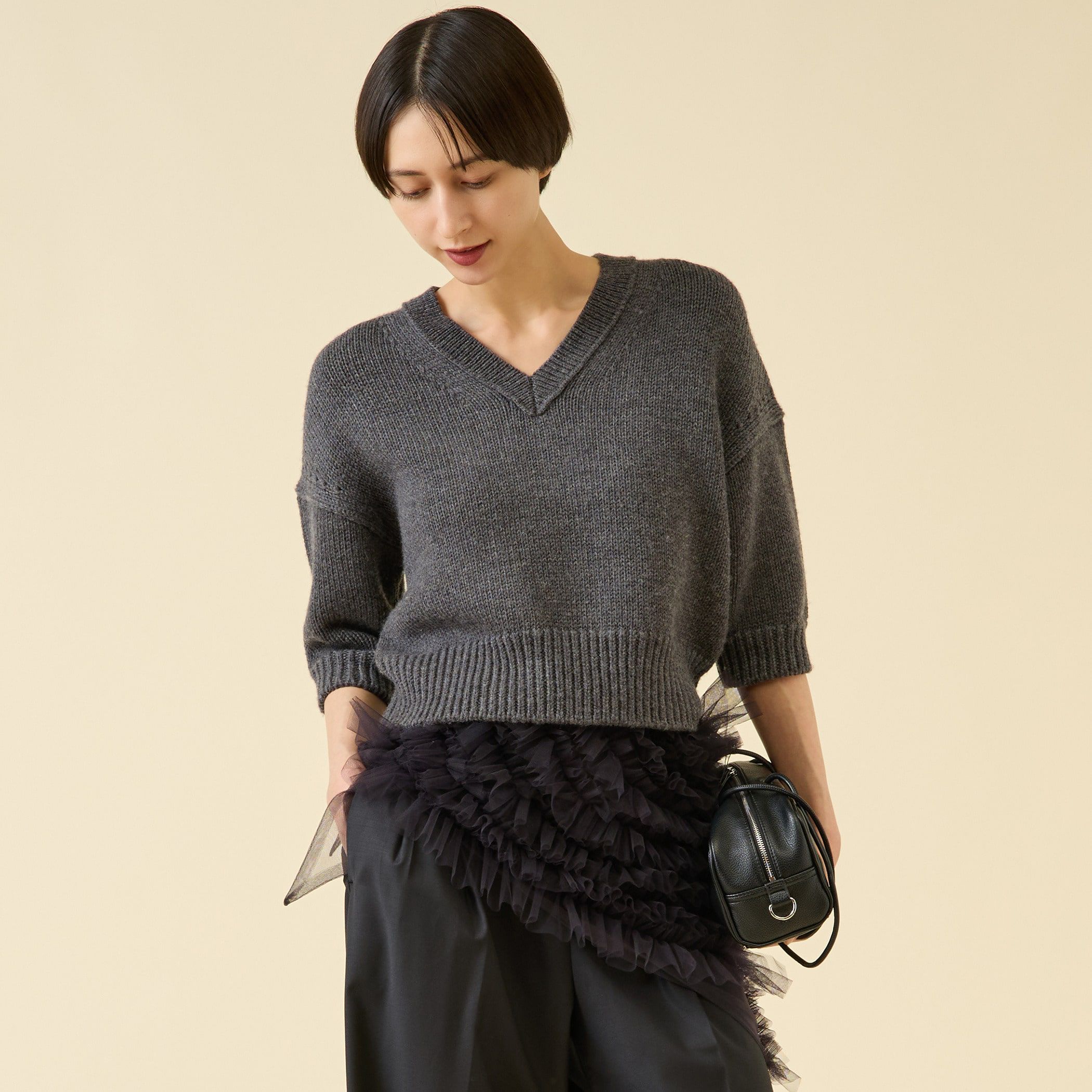 コンパクトなシルエットバランスが今年のムードな、ハーフスリーブのプルオーバーです。程よいドロップショルダーで、リラックス感もあり、カジュアルにも少しきっちり見せたい時にも。≪素材・着心地≫通常よりも軽くなる撚糸の糸を使用しているので、ローゲージですが、そこまで重くならずに着やすいです。≪おすすめの着こなし≫ボリュームのあるボトムスと合わせやすいです。レッド×ボルドーの合わせもおすすめです。