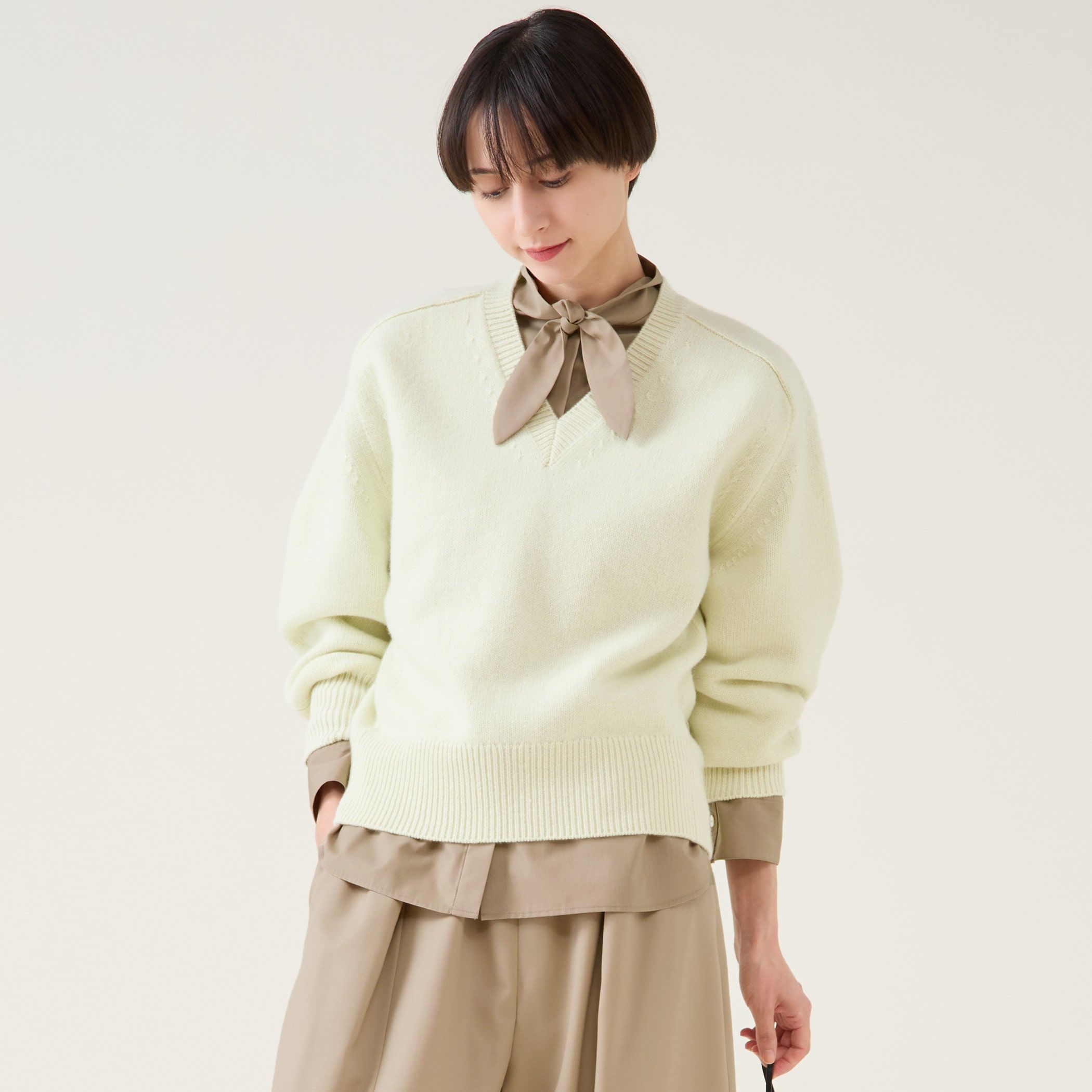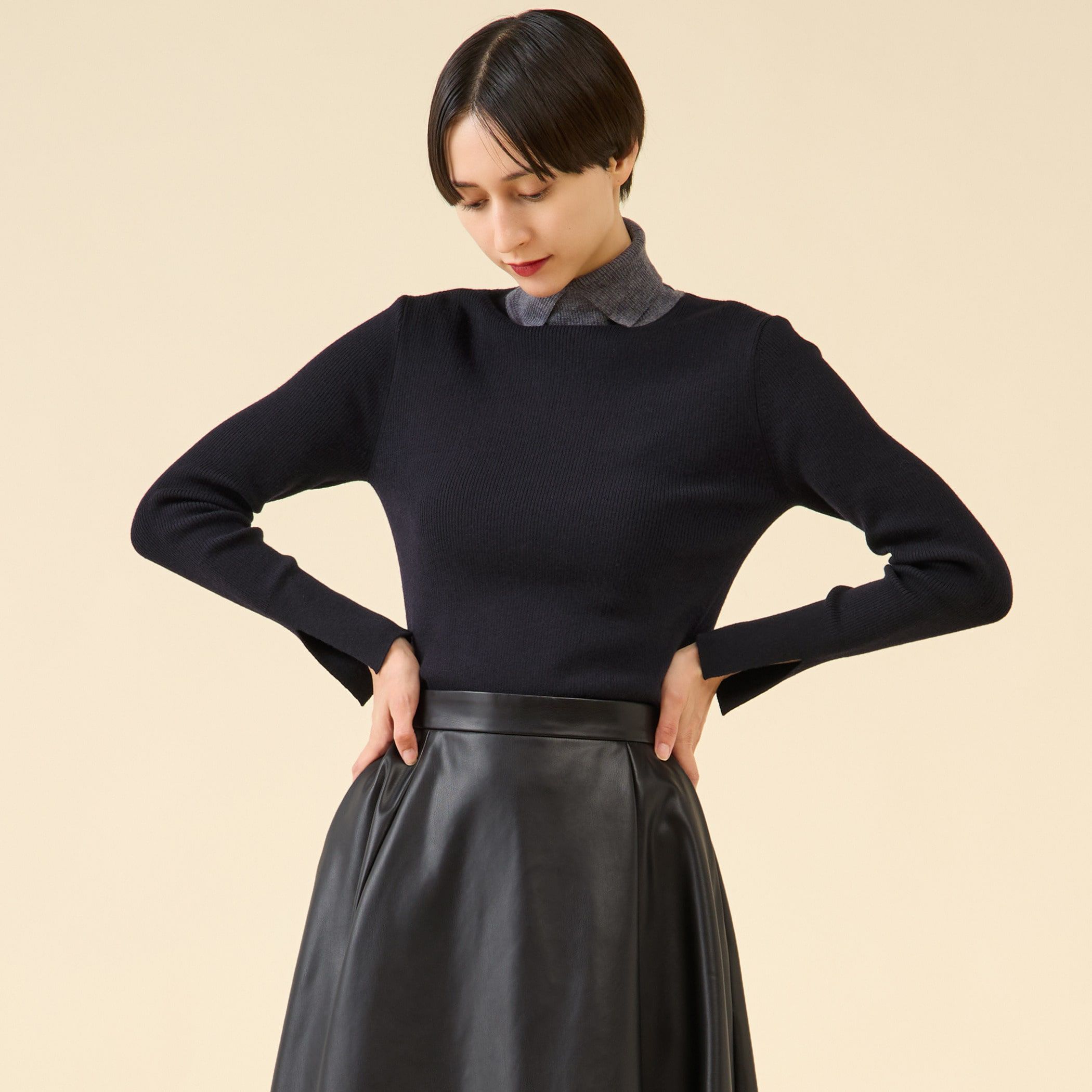 ≪素材・着心地≫梳毛ウールを使用した温かいニット。リブで程良くフィットします。≪おすすめの着こなし≫衿があるニットなので、きちんと見せたい時におすすめ。裾がデザインされているので出して着ても様になります。