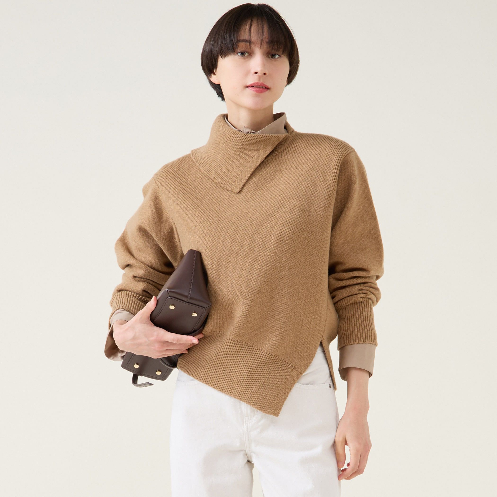 ≪デザインポイント≫アシンメトリーなシルエットですが、着用したときのネックラインやスリットの位置等で女性らしくも見えるように計算しています。≪素材・着心地≫温かみがあり、真冬まで活躍してくれます。タートルネックでは暑く感じてしまう初冬から着やすいネックデザインです。≪おすすめの着こなし≫丈は長めですが、裾のスリットでバランスを取りやすくしています。ボリュームのあるボトムスとも合わせやすいです。透け感:なし伸縮性:あり光沢感:なし裏地:なし生地の厚さ:やや厚い