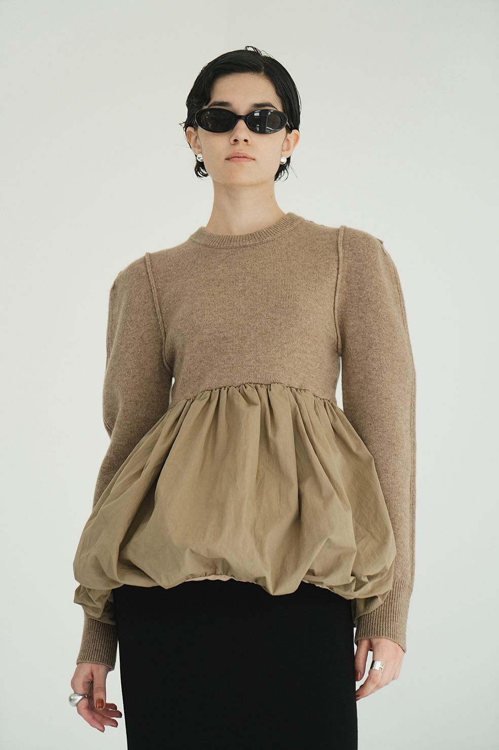 ニット部分にはウール混の肌触りの良いソフトな糸を使用し、袖山にダーツを施すことで、パワーショルダーでモードな印象をプラス。スカート部分にはハリ感のあるコットンナイロン素材を使用し、贅沢にタックギャザーを入れることで、立体感のある美しいフォルムを実現。一枚でスタイリングが完成する、存在感のある主役ニットです。