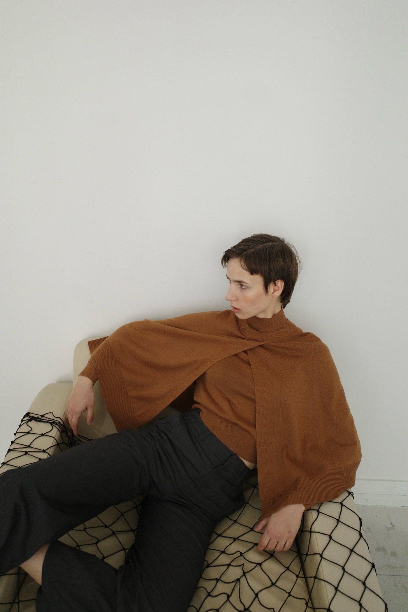 ケープはあえてアシンメトリーなデザインにすることで、肩から自然に羽織ったり、マフラーのように首に巻いたりと、幅広いスタイリングが楽しめます。インナーのハイネックロングスリーブは、シンプルでコンパクトなデザインに仕上げており、単体でも活躍する万能な一枚です。ソリッドなハイゲージ糸を使用し、滑らかな肌触りと上品な光沢感もポイント。セットでも単品でも着られる、スタイリングの幅を広げてくれるアイテムです。---------------------------裏地:なし透け感:なしストレッチ:あり---------------------------※光の当たり具合や端末等の閲覧環境によって、実際の色味と異なって見える場合がございます。予めご了承ください。※表記サイズは商品の実寸で、布製品の特性上、表記サイズと多少の誤差が生じる場合がございます。※画像の商品はサンプルの為、実際の商品と色味、仕様、加工、サイズ、素材等が若干異なる場合がございます。