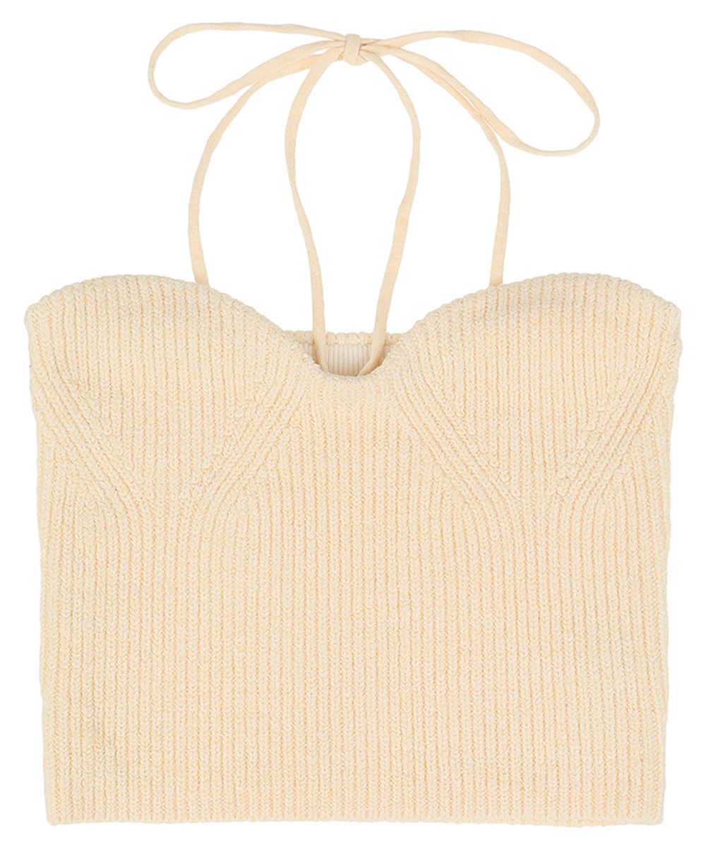 素肌でも着用できるよう、少しシャリ感のある肌触りが柔らかい糸を使用しました。1枚でのスタイリングはもちろん、トップスとのレイヤースタイリングもおすすめです。付属の紐は取り外しができるので、お好みでアレンジしていただけます。